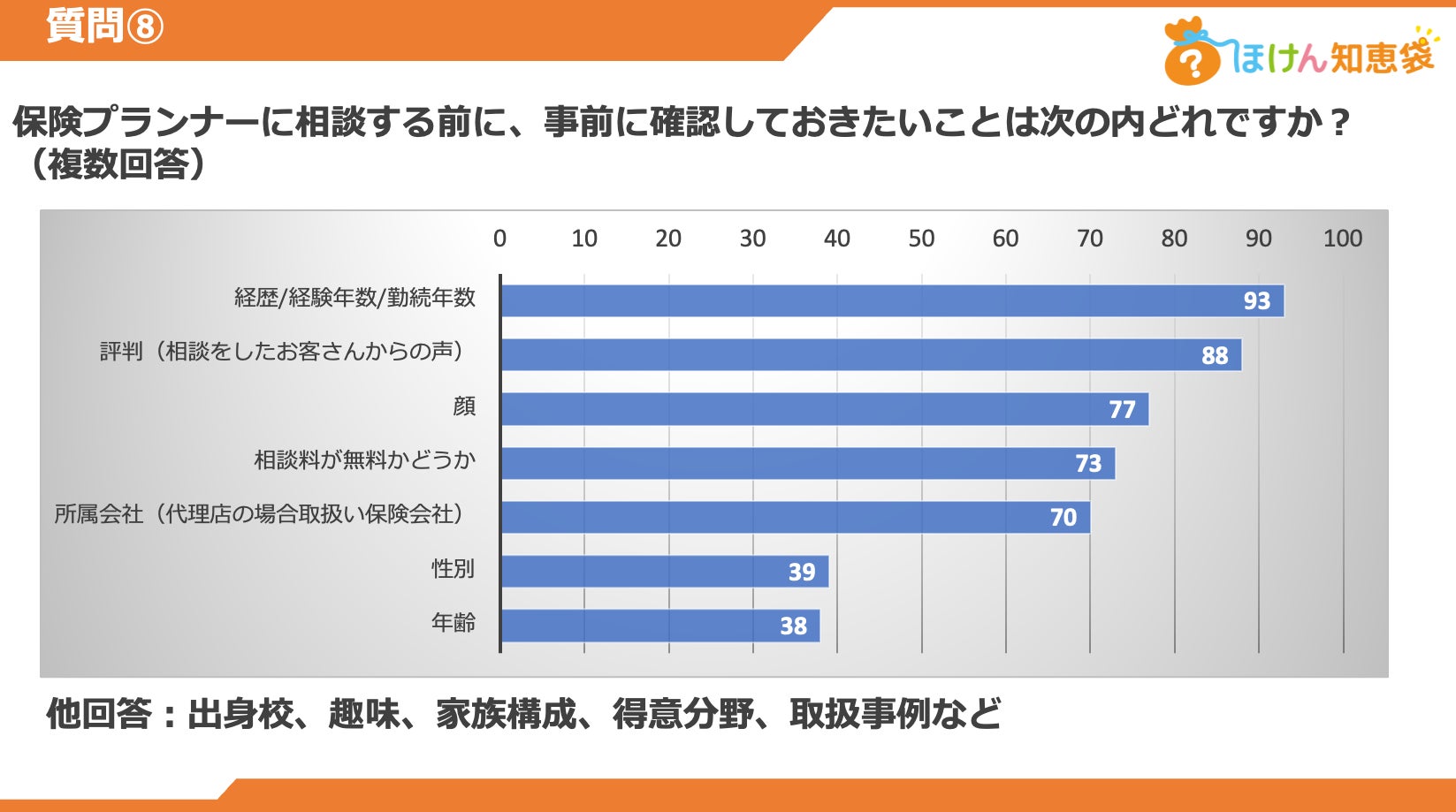 消費者は保険プランナーに対して「経歴」や「経験年数」「評判」といった客観的な情報を事前に知りたいと強く望んでいます。これらの情報は、プランナー選びにおける重要な判断基準であり、消費者の信頼感を高める要素となります。業界としては、消費者が必要とする情報をわかりやすく提示し、プランナーと顧客の間に透明性を確保することが重要です。