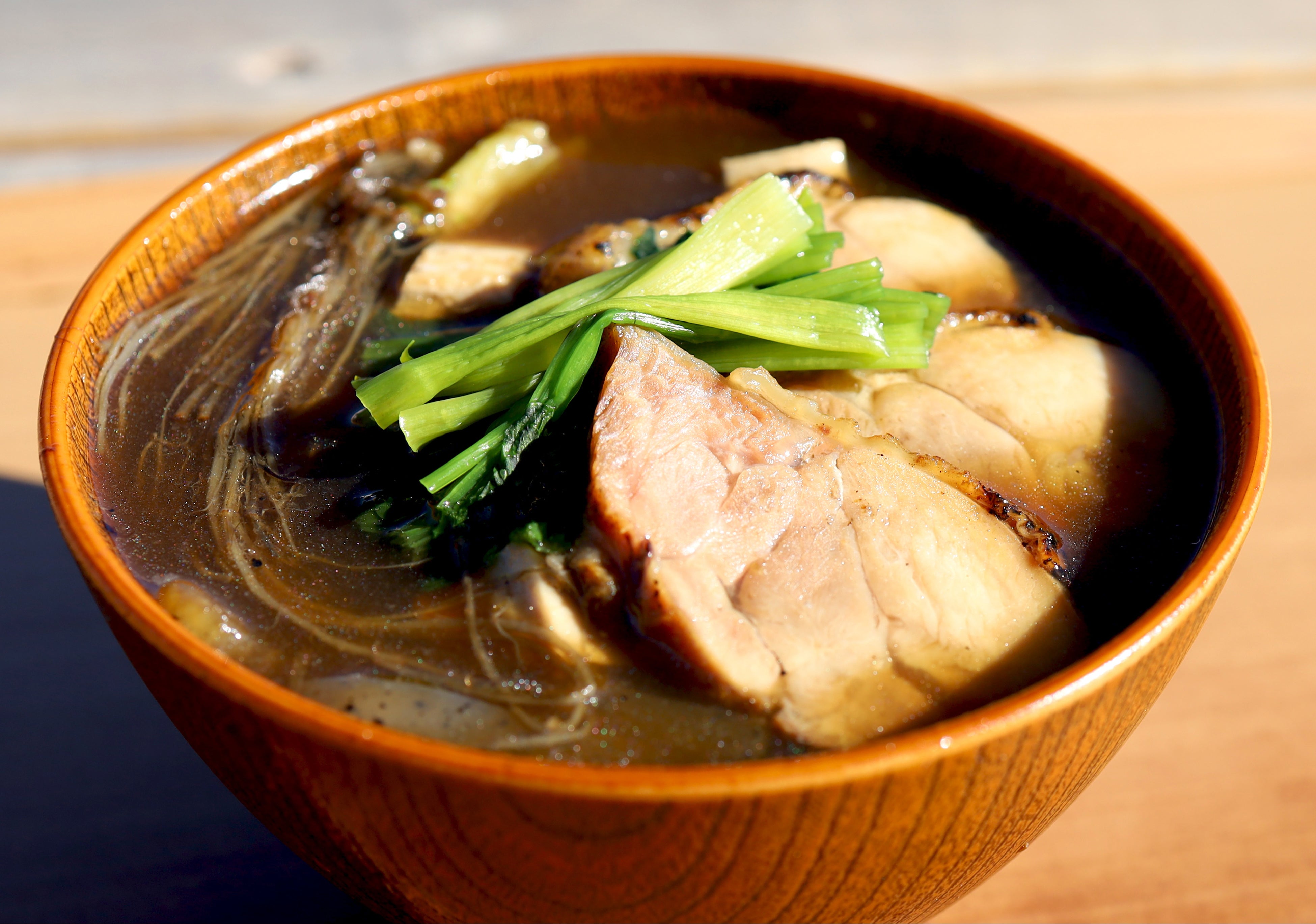 半分ほど召し上がって頂いたら丹沢滋黒軍鶏100%のあつあつ白湯スープをかけていただき、ひつまぶし風としてお召し上がりいただけます。