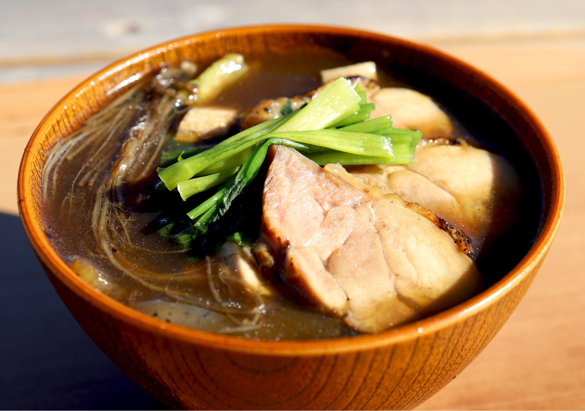 滋味深い丹沢滋黒軍鶏のむね肉を存分に生かすために霜降りをし、醤油ベースのタレと