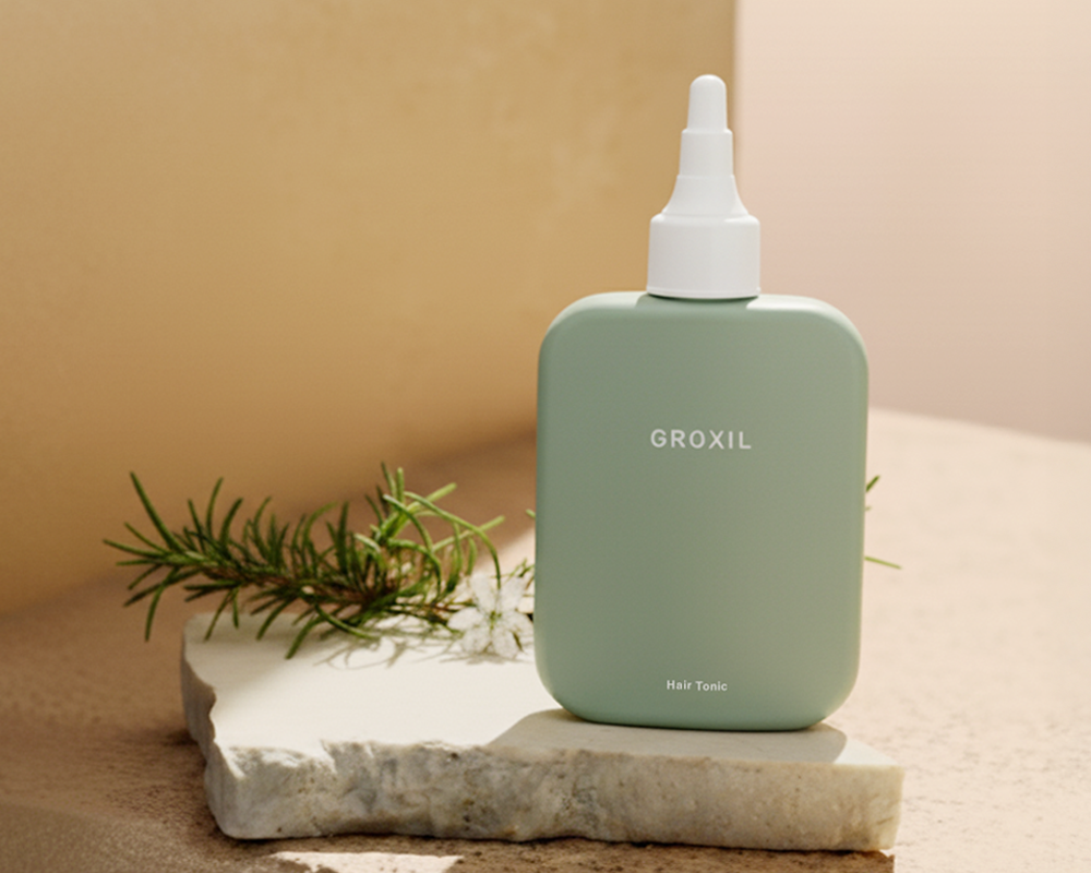 生まれ変わったGROXIL(グロキシル)ヘアトニックのパッケージデザインは、女性が日常的に使いたくなるよう、落ち着きがあり洗練されたスタイルへ一新。