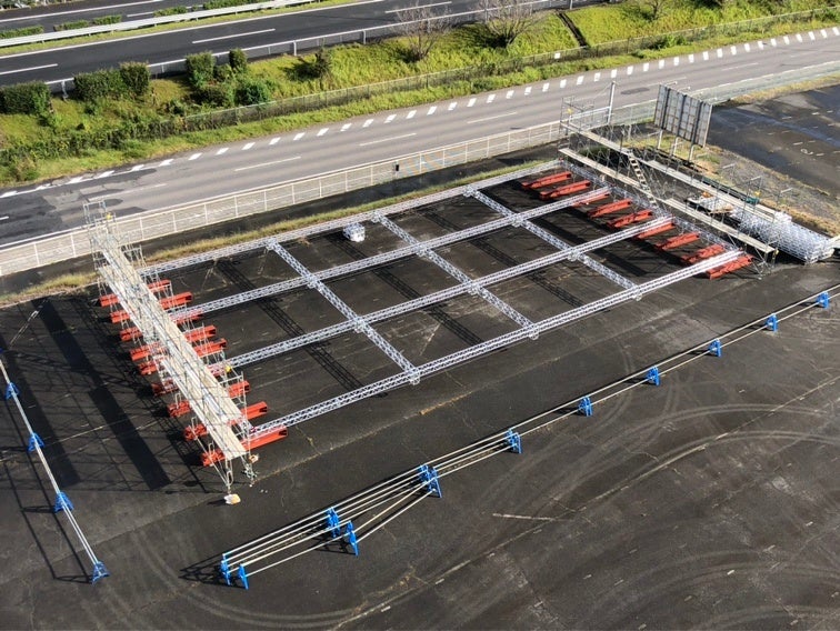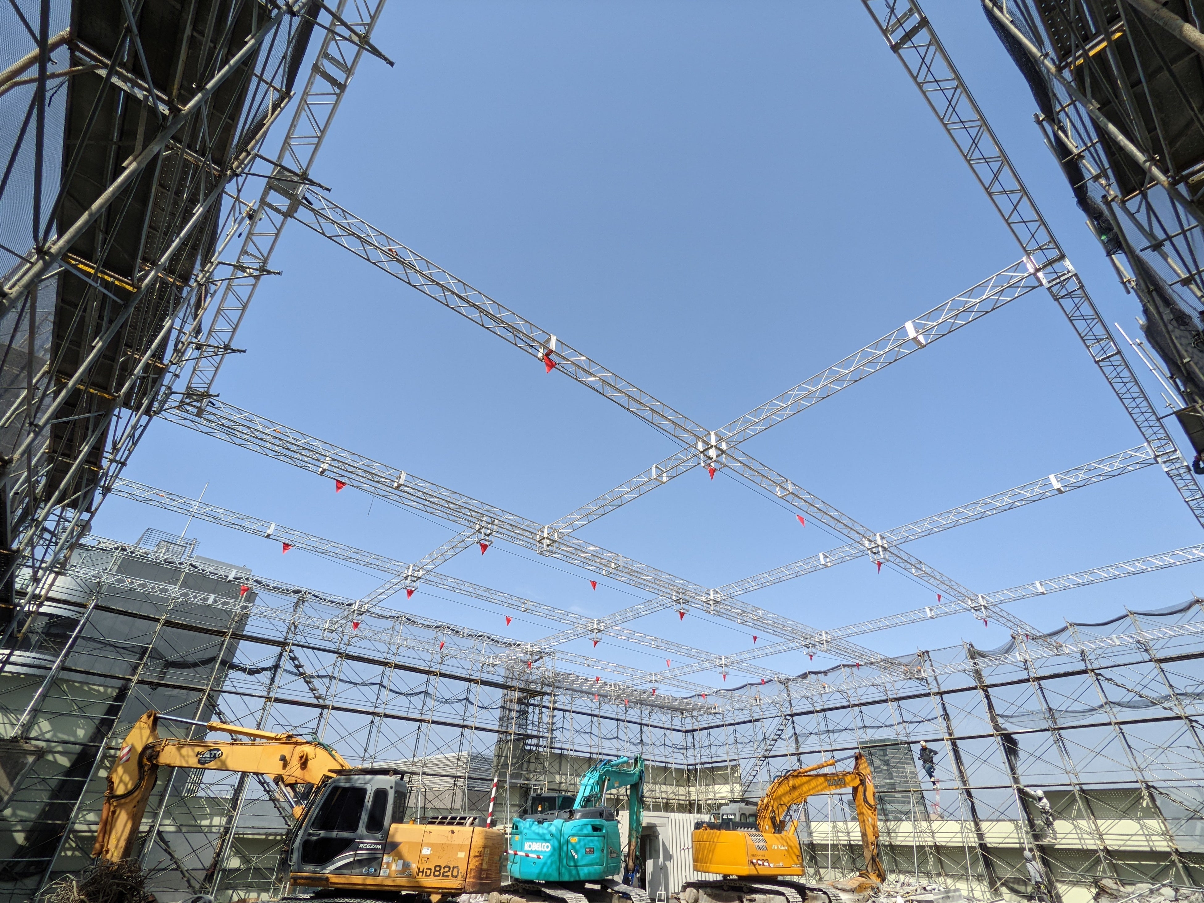 主材には軽量なアルミBOXトラスを採用。15.3m×27.4m程の大きなスパン構成であっても、