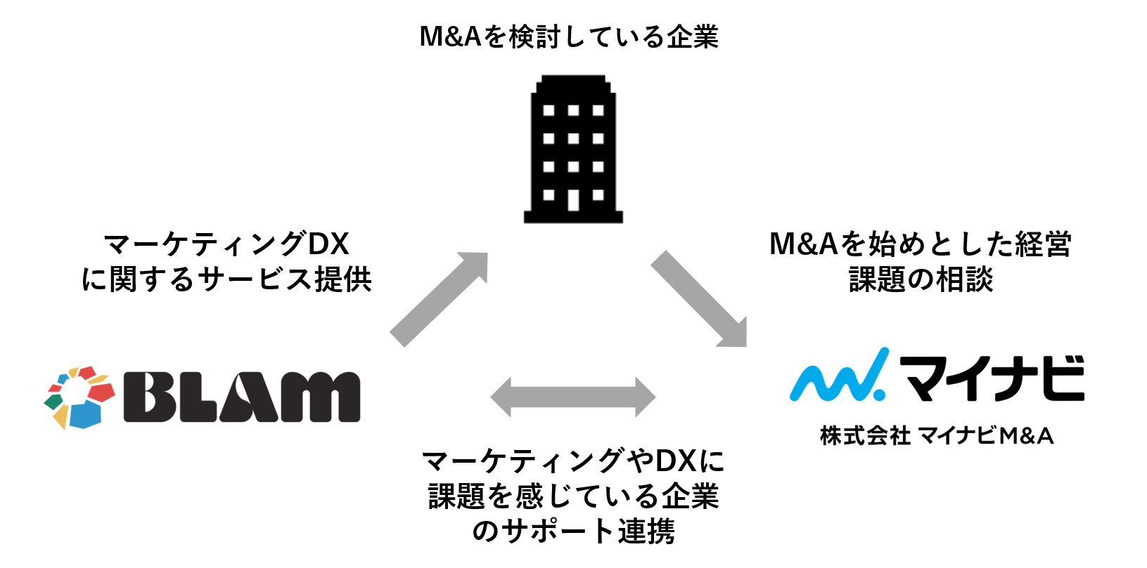 BLAMとの業務提携を通じて、M&Aの検討・実施に伴って発生する各種課題に対して、マイナビグループのノウハウ・プロダクトを活用したHR領域における支援のみならず、BLAMが持つマーケティングDX領域におけるノウハウ・プロダクトを活用することで、より実践的なサービス提供を実現します。