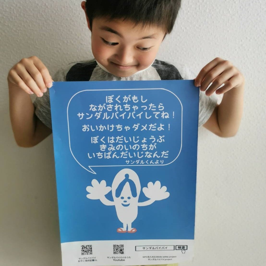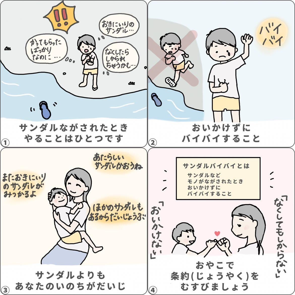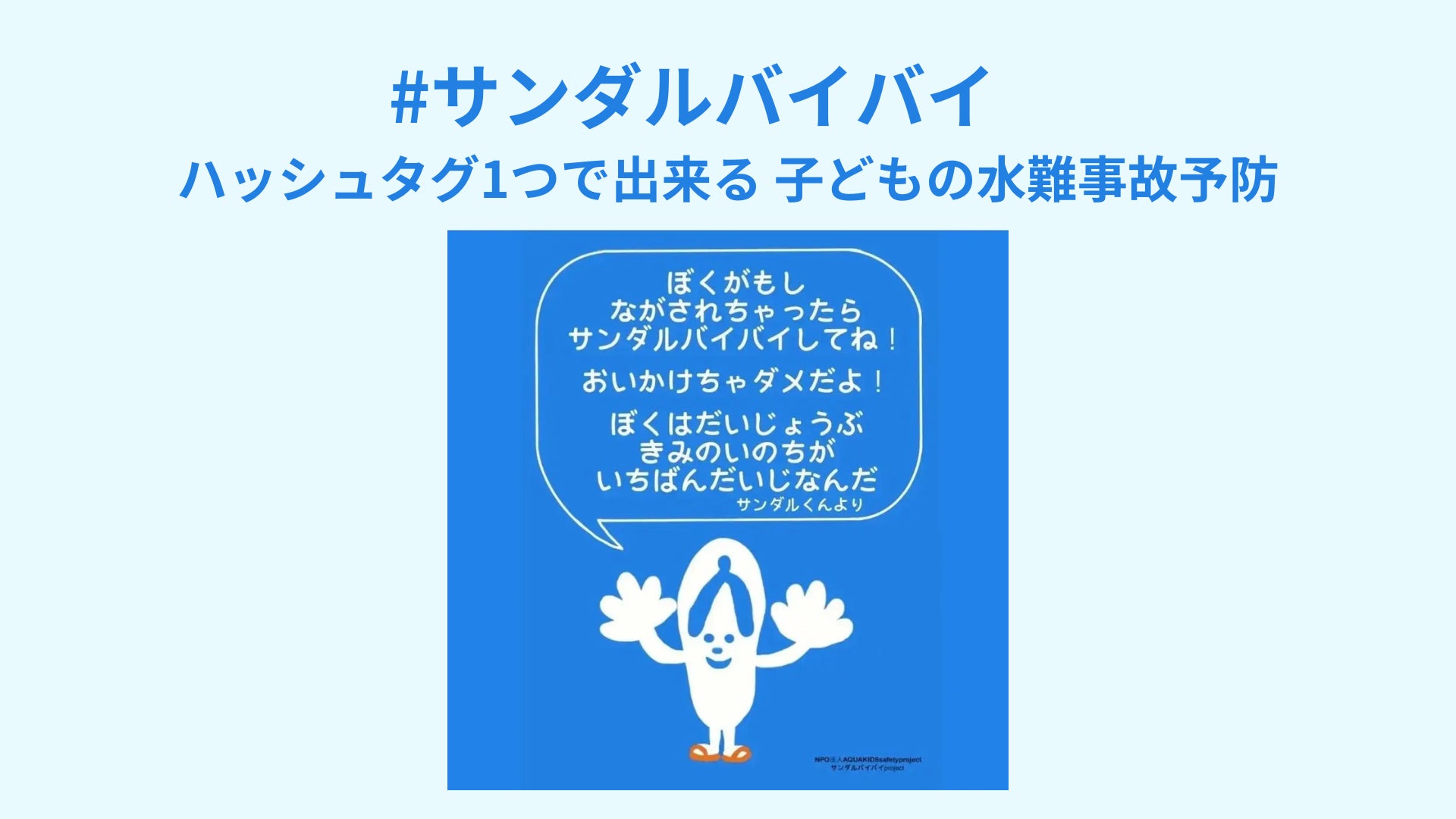 流されたサンダルなどを追いかけて溺れる水難事故を予防するキーワード。(流されたサンダルなどを追いかけて溺れる水難事故は6年連続で発生しています。当法人調べ。)サンダルは買えても、命は買えません。「流されたサンダルはバイバイしよう」サンダルバイバイには、これまでTwitter上で3000以上のいいね!がつき、関連動画再生回数は10万回以上で、現在も更新中です。「流されたモノは追いかけない」という事故予防のアクションに、直接繋がりやすいキーワードとして、NHKニュースやEテレ、各新聞でも取り上げられ、公立小学校の教材としても活用されています。