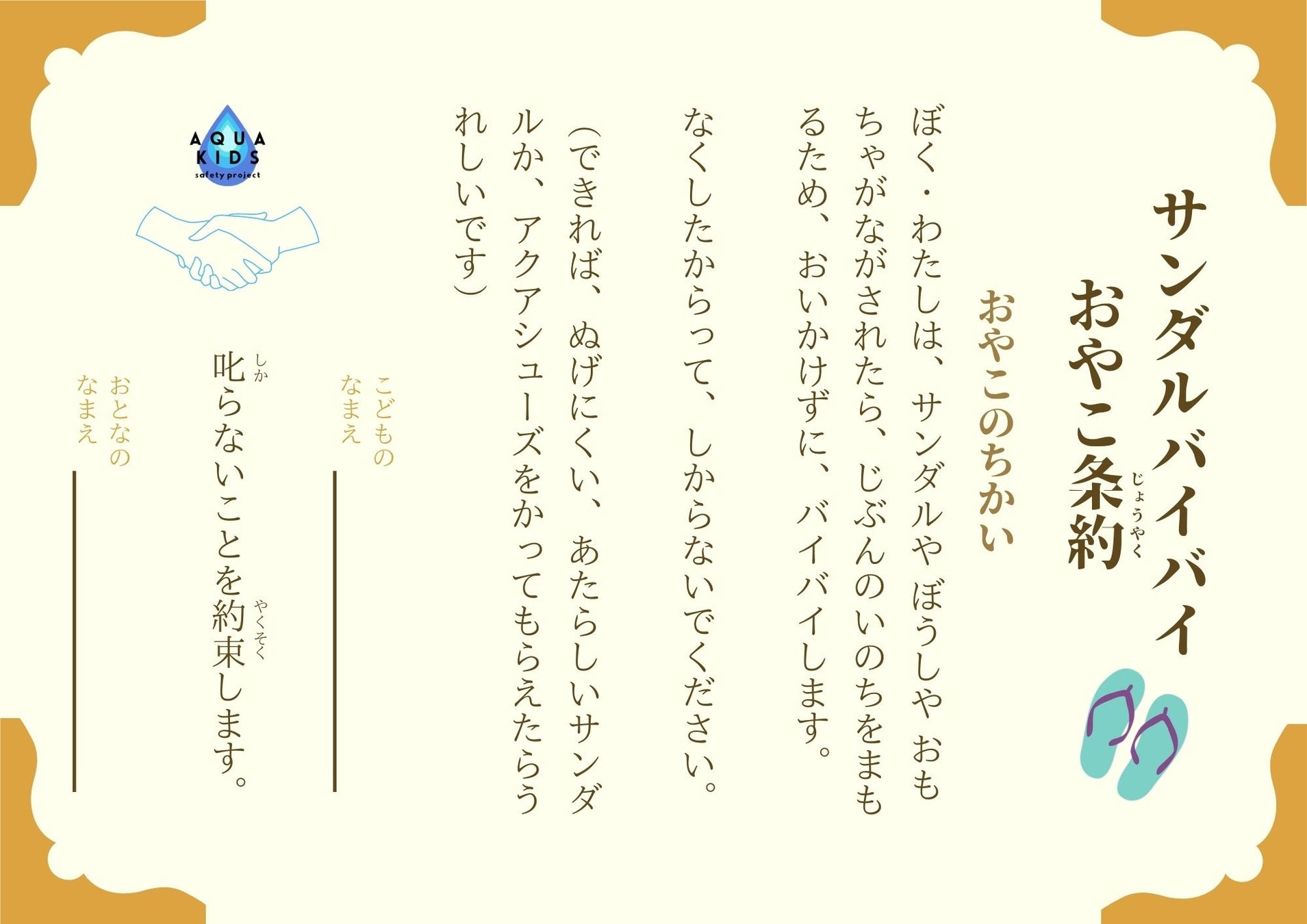 (サンダルバイバイおやこ条約証書はHPより無料DL、サンダルバイバイのうたはyoutubeにて公開中)