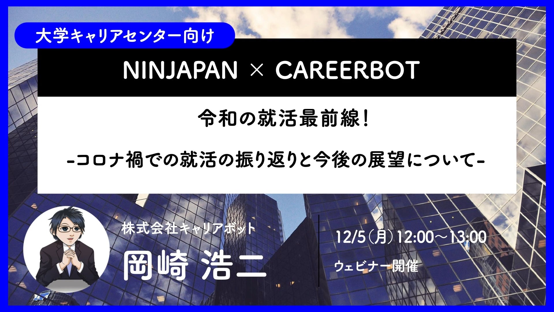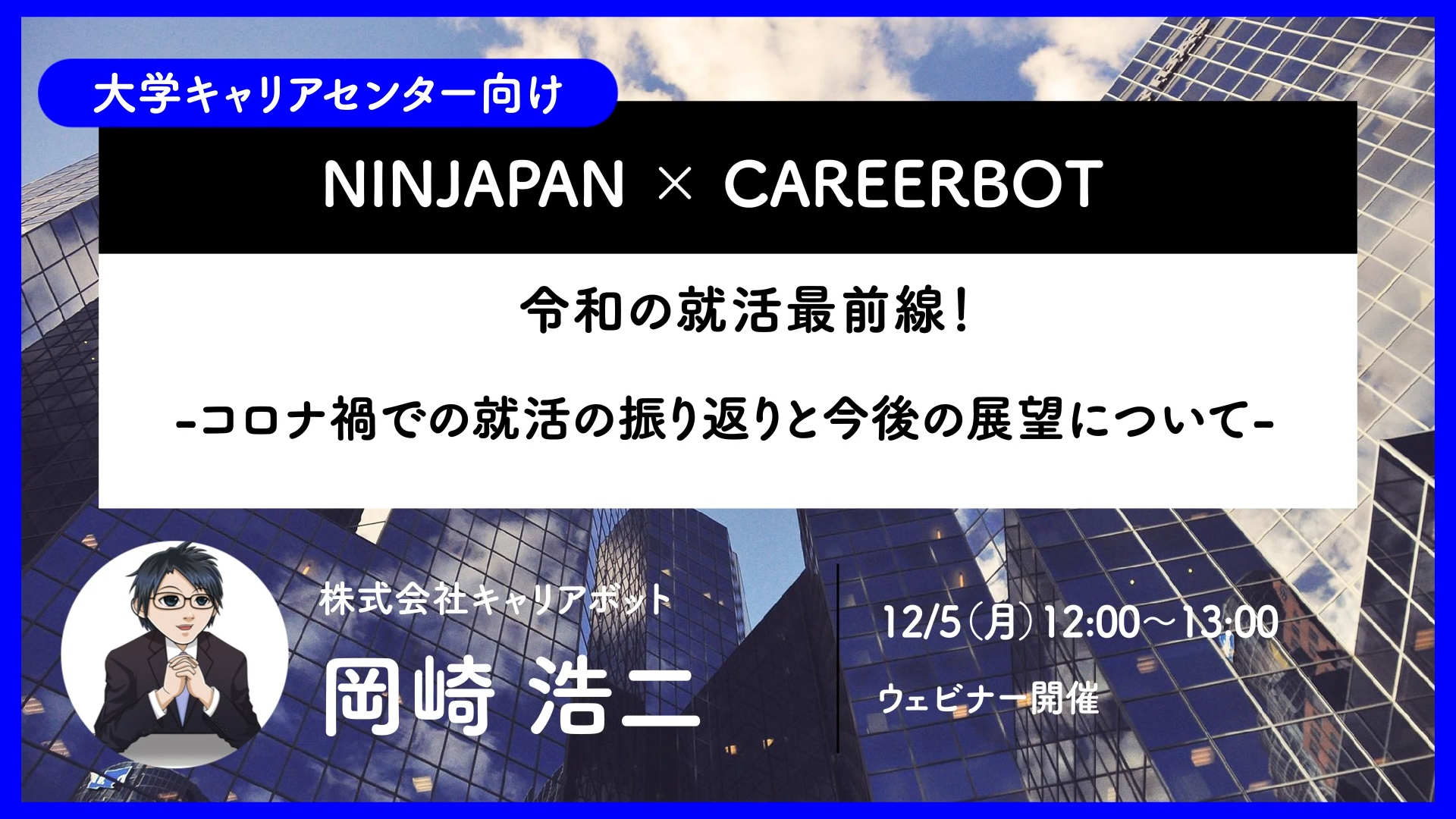 Abuild就活を運営するNINJAPAN株式会社(本社:東京都新宿区 代表取締役:新井翔太、新井景介、以下「NINJAPAN」)と大学向けDX推進を行う株式会社キャリアボット(本社:東京都世田谷区 代表取締役:岡崎浩二、以下「キャリアボット」)は、2022年12月5日(月)に、大学キャリアセンター向けウェビナー『令和の就活最前線!-コロナ禍での就活の振り返りと今後の展望について-』を開催いたします。