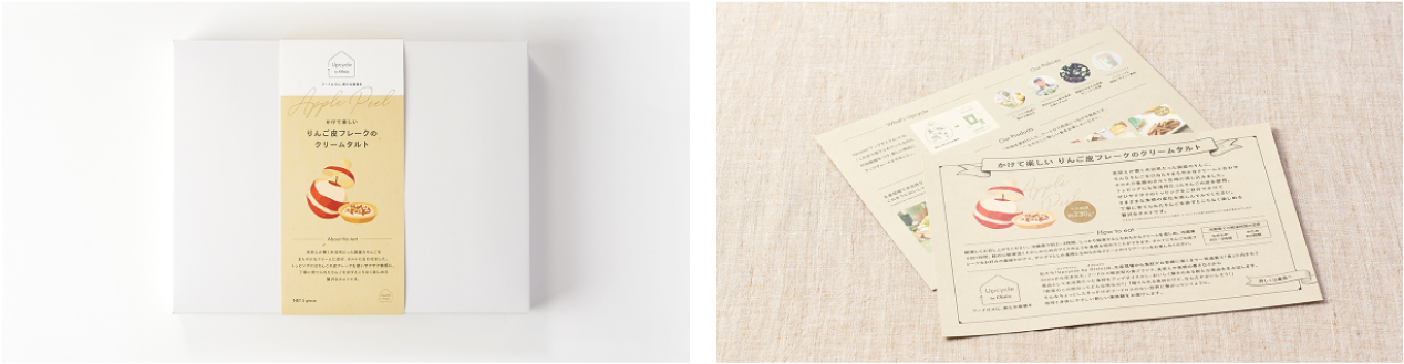 まずは、オイシックス・ラ・大地株式会社の「かけて楽しい サクサクりんご皮のクリームタルト」のパッケージやリーフレットに使用されます。今後も素材を広く普及させることで、フードロス削減への貢献を目指します。