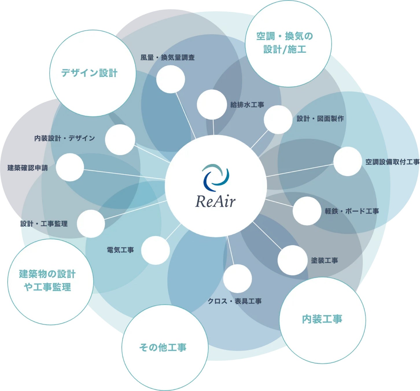 「ReAir」は、空調設備会社として培った高度な技術とノウハウをベースに、建築・内装・設備をワンストップで提供するコンサルティングブランドです。 デザイン性と機能性を両立させた空間づくりに加え、換気不足や温度ムラ、ニオイといった「空気の悩み」を解消し、そこに集う人々の快適性と健康、そして建物の資産価値向上を実現します。