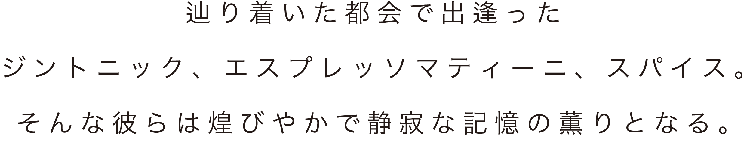 辿り着いた都会で出逢った嗜好品は、煌びやかで静寂な記憶の薫りとなる。その景色や複雑にも美しい感情のようなものを抽象的に表現した新フレグランスのコレクション。