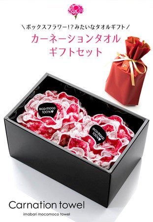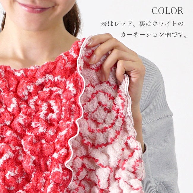 「カーネーションタオル」 まるでボックスフラワーのような華やかさ。 大切な日に贈りたい「カーネーション」をイメージした「モコモコ・フェイスタオル」の2枚セットです。 ギフトボックスに ラッピング済みの商品です。 フリルみたいな花びらが、ぎゅっと集まった可愛らしいカーネーション。 その可愛らしさを大人気のモコモコタオルでギフトに仕上げました。 タオル生地を多めに使用しているので、使い心地はもちろん、吸水面もアップするので、更に良く水気を吸ってくれます。 縦横に、伸びるストレッチ加工を施している為、ヘアータオルとしてもオススメです。 洗髪後、濡れた髪をまとめやすく、ズレ落ちにくいので、髪を乾かすまでの煩わしさを軽減してくれます。 タオルは安心と信頼の今治産。 肌の触れ心地と吸水性の良さは、お使いいただく方に、きっとご満足いただけることでしょう。