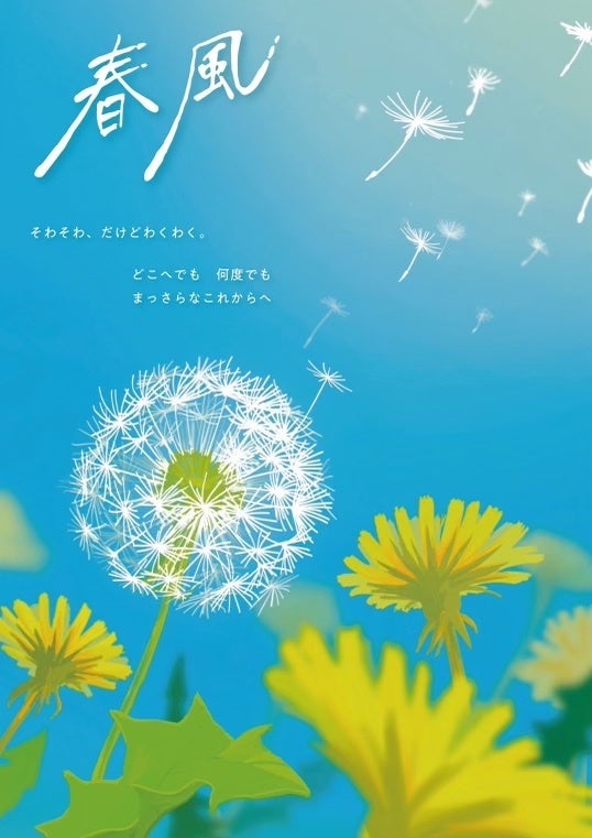 ふわふわと飛んでいく綿毛が、新生活を過ごす人に寄り添って、この先の生活へと共に進んでいけたらと思いが作品に込められています。綿毛ひとつひとつが風で舞い上がり、徐々に上へと曲線を描いて飛んでいくような配置