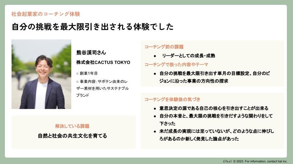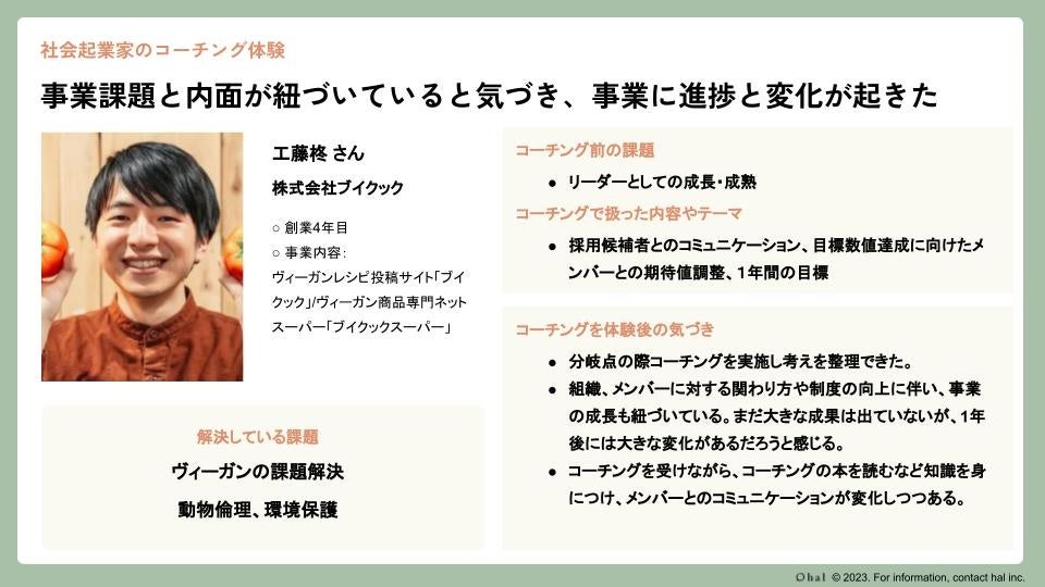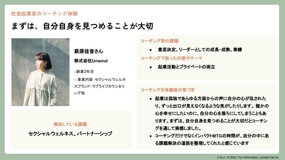 「心理援助の民主化」を掲げるhal株式会社(本社:京都市西京区、代表取締役:山田瑠人)は、社会起業家に伴走する「Social Coaching」のアニュアルレポートを公開いたしました。