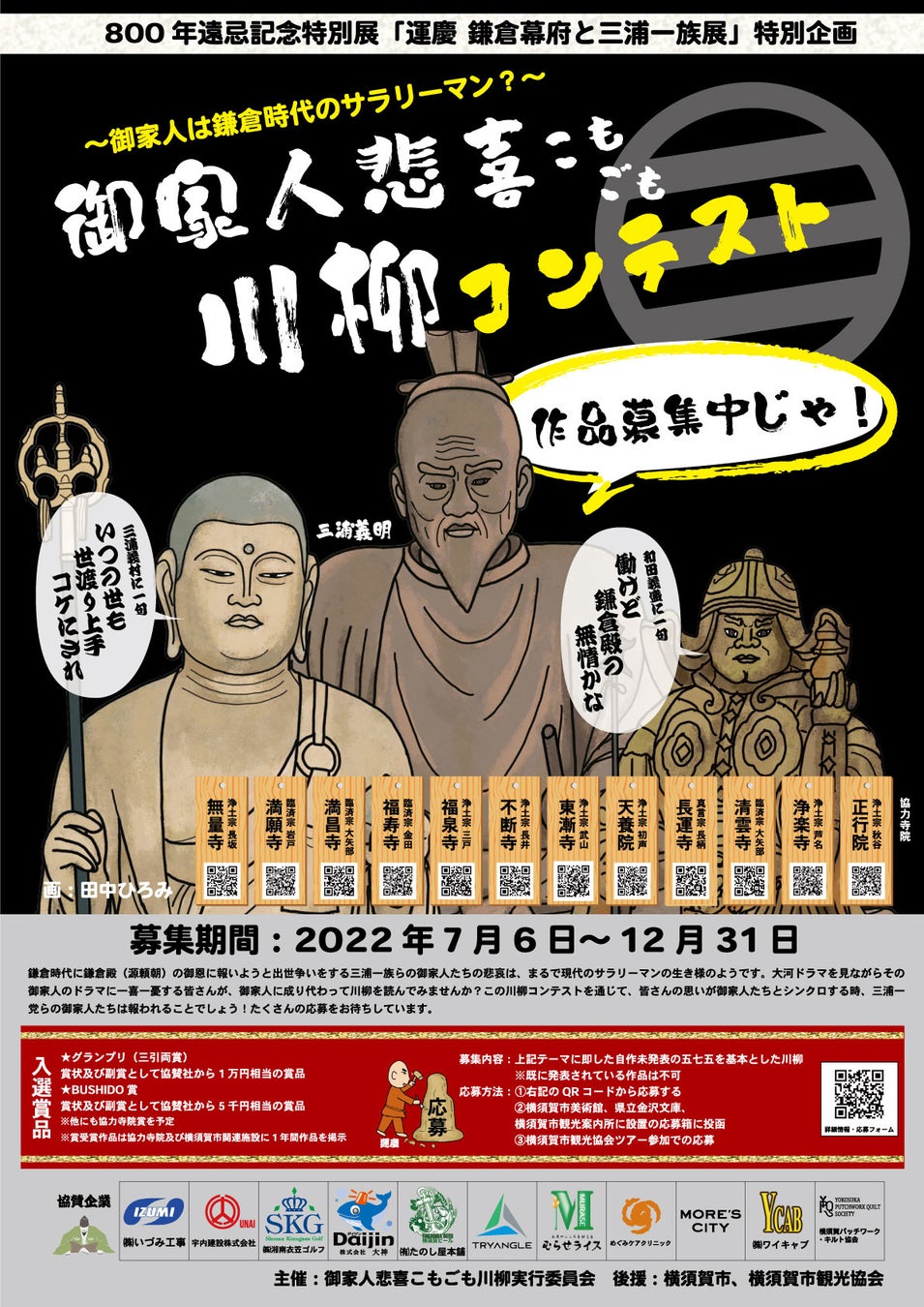 一般社団法人BUSHIDO文化協会(以下、B文協。代表理事:土川憲弥、神奈川県横須賀市)が事務局を務める「御家人悲喜こもごも川柳コンテスト実行委員会」(以下、実行委員会。会長:伊藤一美(三浦一族研究会会長))では、鎌倉時代の三浦一族等の御家人の権力争いやその象徴である運慶作仏像等の文化財にまつわる物語をテーマにした川柳を募集するコンテスト「800年遠忌記念特別展 運慶 鎌倉幕府と三浦一族展 記念 御家人悲喜こもごも川柳コンテスト~御家人は鎌倉時代のサラリーマン?~」(以下、コンテスト。)の開催に伴い、令和4年7月6日(水)より、その受付を下記のように開始しますのでお知らせいたします。