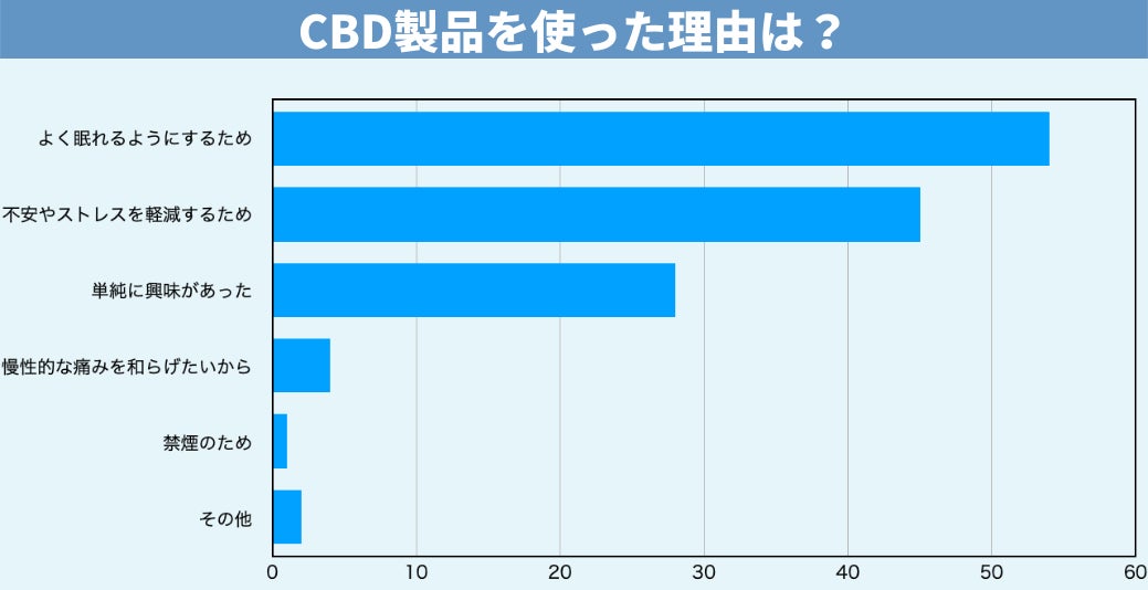 - CBD製品を使う理由としては「眠れるようにするため」「ストレスを減らしたい」など