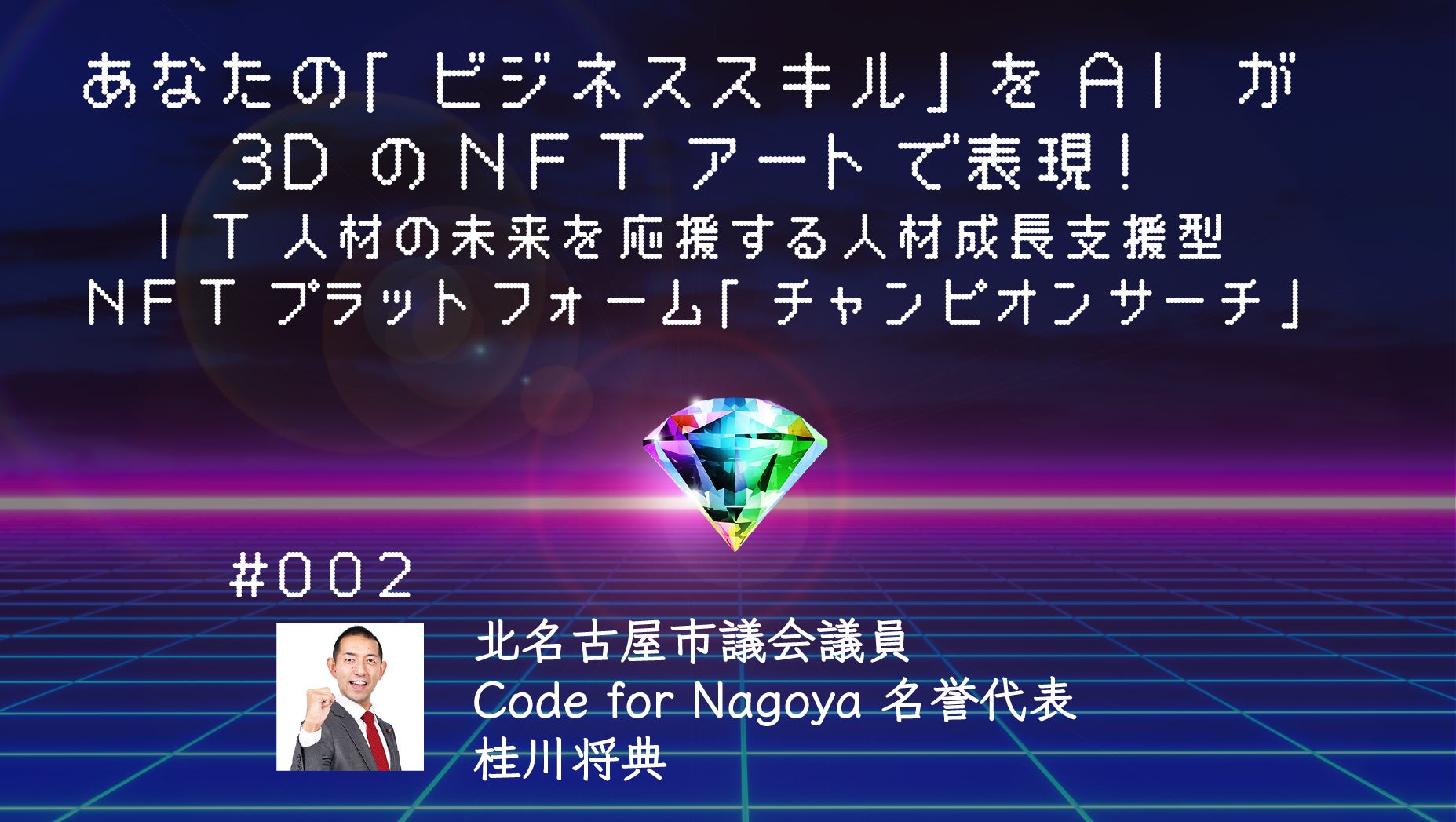 株式会社Number(本社:東京都渋谷区、代表取締役:小林 涼菜)は、「NFT×人材」の切り口から、IT人材の未来を応援するスキル支援型NFTプラットフォーム「チャンピオンサーチ」におきまして、チャンピオンサーチが発行するNFT「スキルジェム」を発行した第二弾を2022年6月22日に公開いたします。第二弾は、北名古屋市議会議員/Code for Nagoya 名誉代表の桂川将典さんです。
