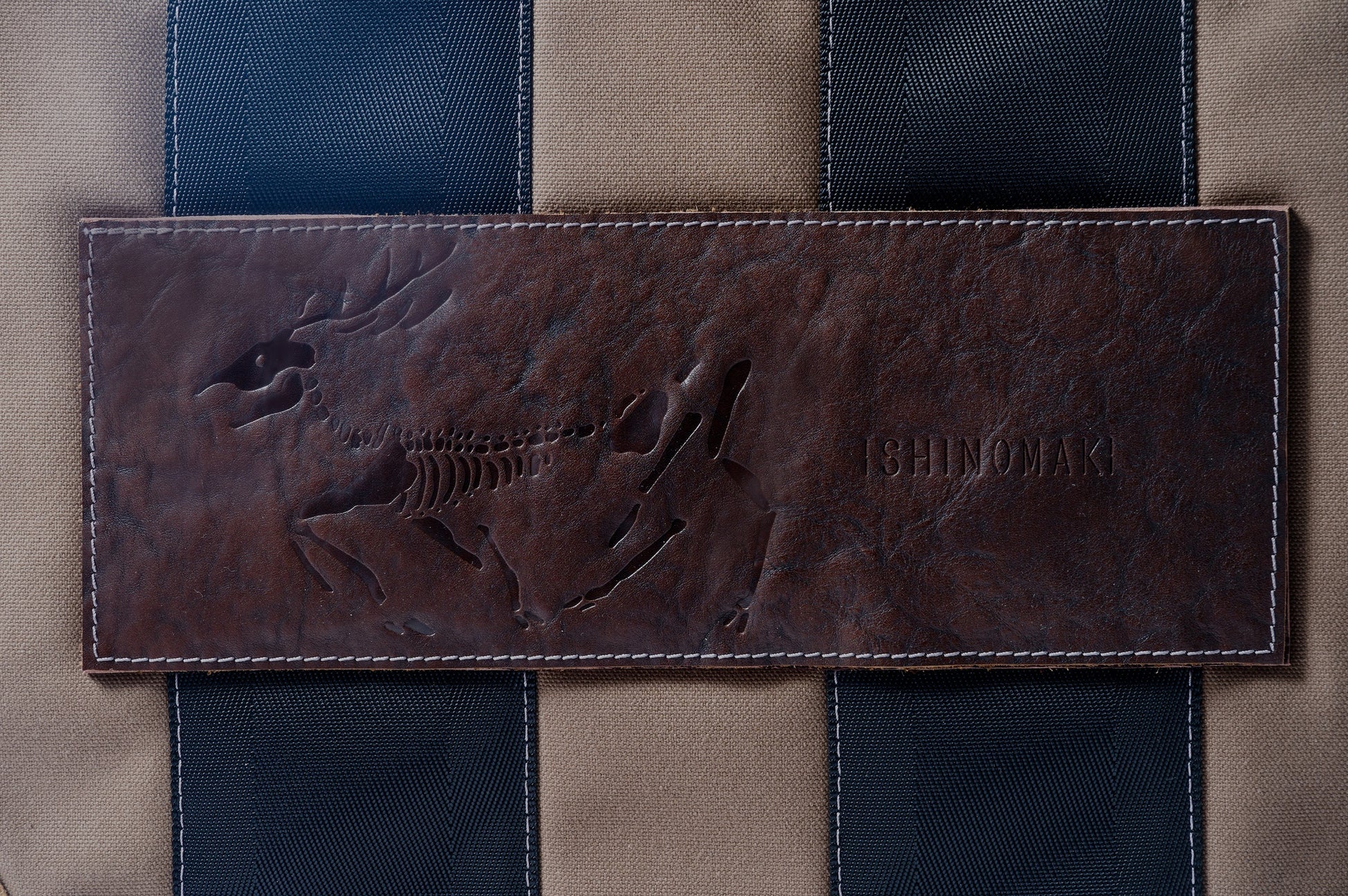 「鹿の骨」は当社がプロデュースするTAKIBISM x ISHINOMAKIプロジェクトの焚火台や五徳の収納/運搬用にデザインされ、非常にタフな作りが特徴のバックです。中央部には石巻市在住の作家 福田美里氏によるイラスト「SHIKA NO HONE」が大胆に型押しされています。「SHIKA NO HONE」が型押しされた革とドットボタンの革タブはMONSTROUSAの製造元であるダダグラムが舞台やアミューズメントパークなどで使用した革ジャンバーの端材をサイクルアップして使用しており、環境にやさしい上、1つ1つが異なる風合いとなっています。