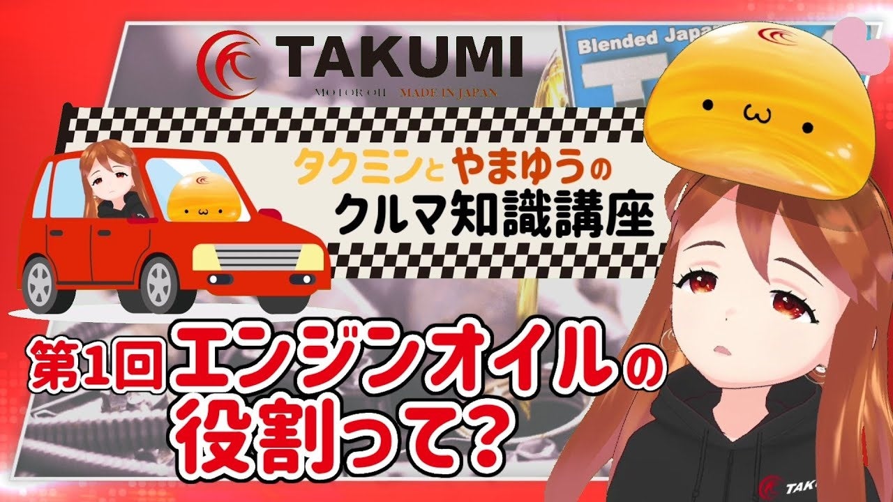TAKUMIモーターオイル公式キャラで物知りなエンジンオイルの妖精【タクミン】と 同じくTAKUMI公式キャラで気だるげなバーチャル社員の【やまゆう】が、 エンジンオイルやクルマほか、色々な機械に関する話題を取り上げて解説します。 記念すべき第1回のテーマは「エンジンオイルの役割って?」です。 はたしてタクミンはエンジンオイルの基本的な役割がどんなものかを、 やまゆうに無事教えることができるでしょうか…?