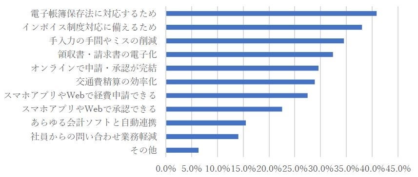 現在、職場で経費精算システムを導入している(または直近で利用していた)と回答した人に「導入した理由・目的」を聞くと、「電子帳簿保存法」「インボイス制度」への対応・備えが1位・2位。テレワークなど柔軟な働き方が浸透する中、新たな法改正もあいまって、企業の経費精算もデジタル化によるDX(デジタル・トランスフォーメーション)が待ったなしの状況といえそうです。