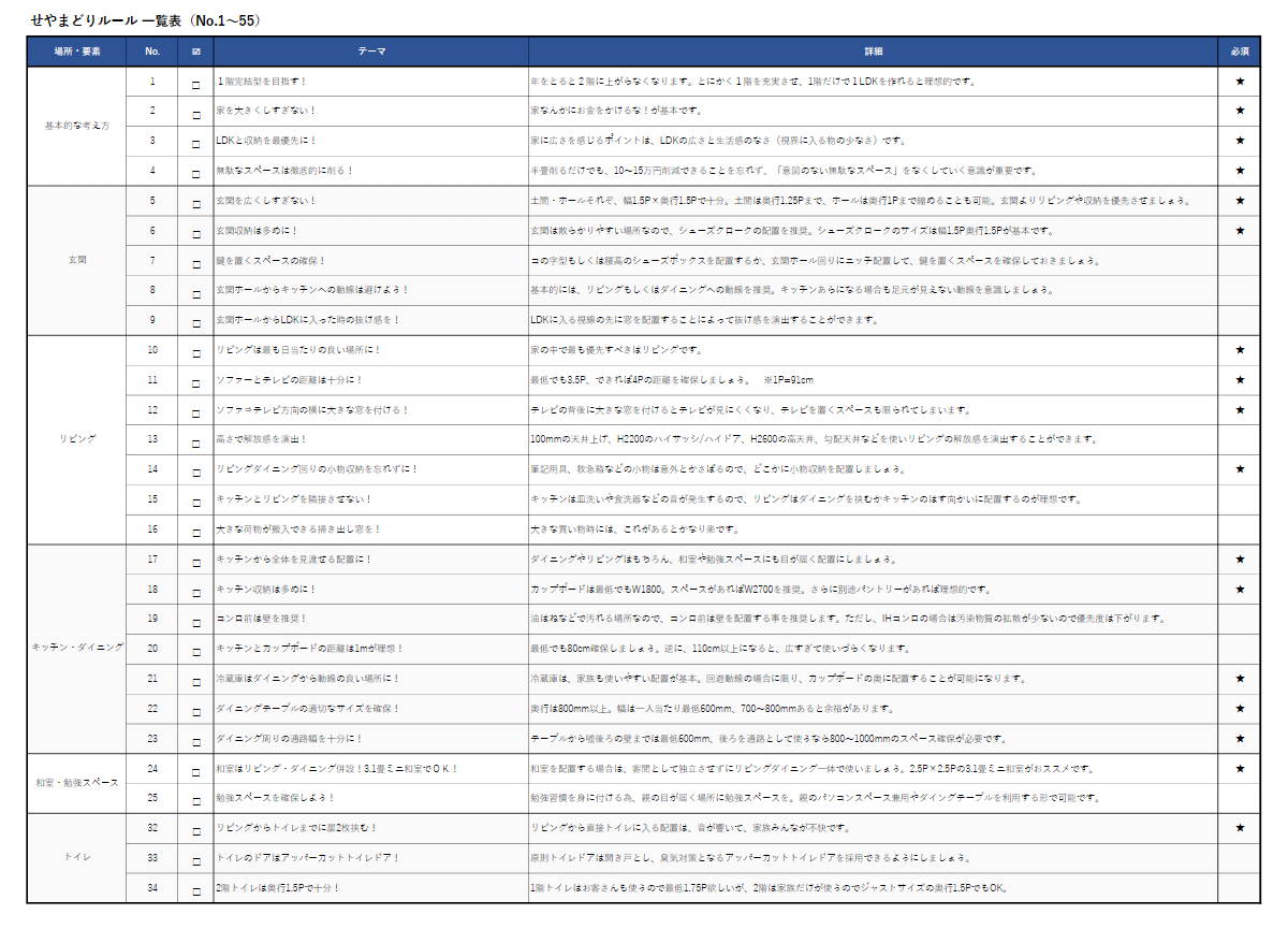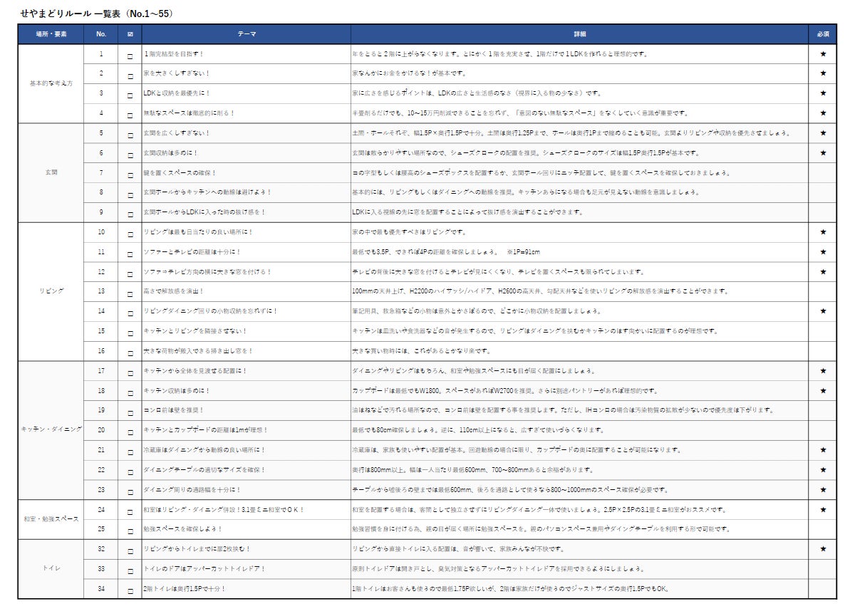 そこで、機能性を重視する点とコンパクトにする点が上手くミックスされており、間取りのちょうどいい塩梅の落としどころを見つけられるのが「せやまどりルール一覧表」です。