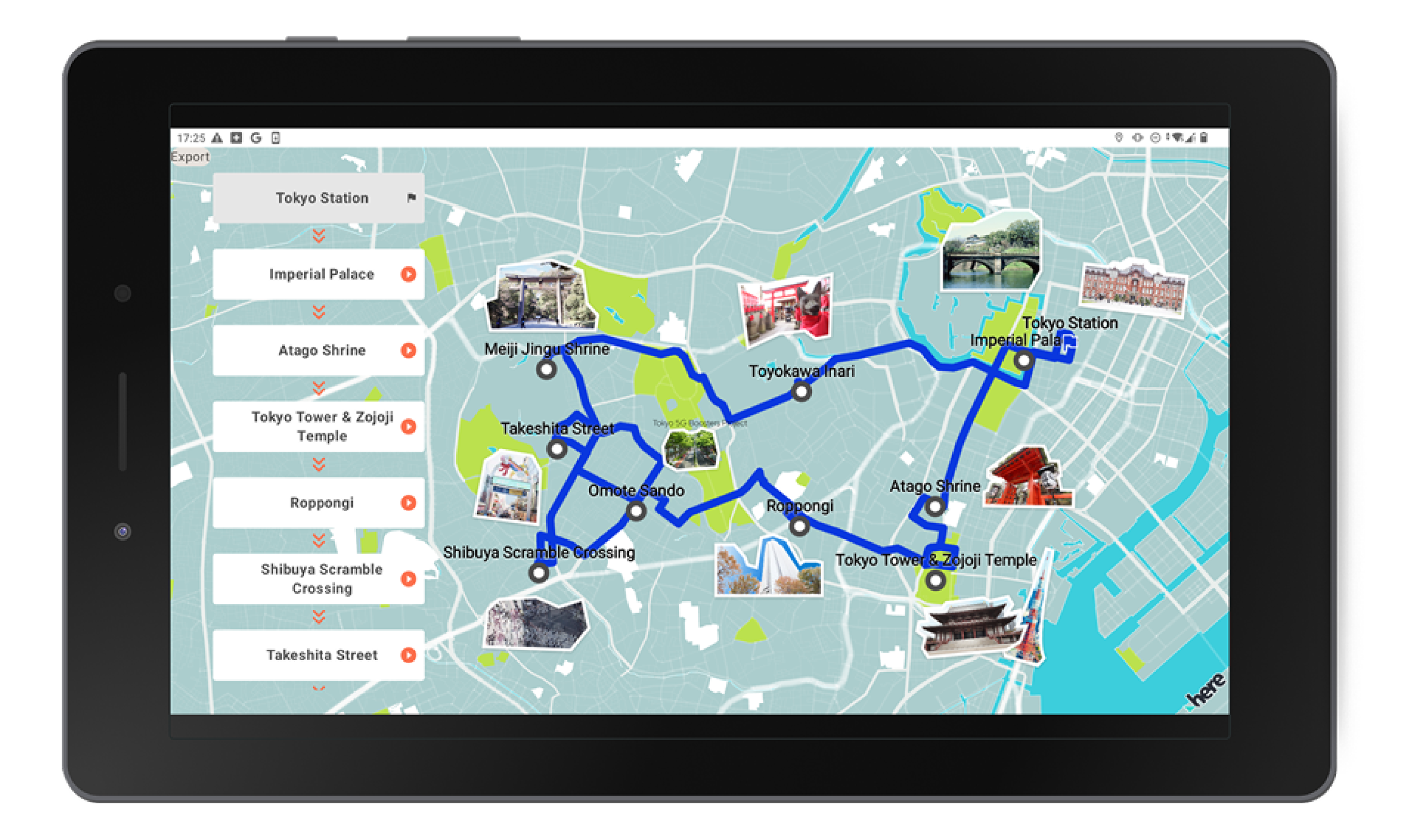 観光ルート表示機能:観光マップ上に訪問予定の観光地や周遊順を表示し、移動中のワクワク感を演出。