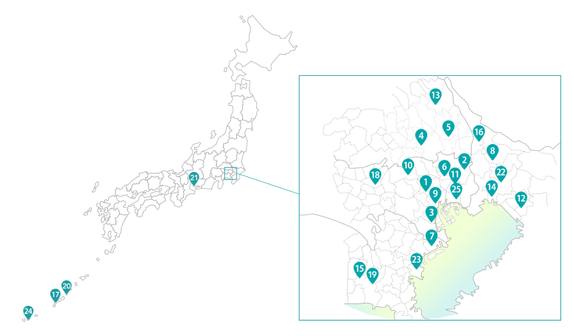 ①悠翔会在宅クリニック新宿/②悠翔会在宅クリニック葛飾/③悠翔会在宅クリニック品川/④悠翔会在宅クリニック川口/⑤悠翔会在宅クリニック越谷/⑥悠翔会在宅クリニック北千住/⑦悠翔会在宅クリニック川崎/⑧悠翔会在宅クリニック柏/⑨悠翔会在宅クリニック新橋/⑩悠翔会くらしケアクリニック練馬/⑪悠翔会在宅クリニック墨田/⑫悠翔会在宅クリニック稲毛/⑬悠翔会在宅クリニック春日部/⑭悠翔会在宅クリニック船橋/⑮ココロまち診療所/⑯悠翔会在宅クリニック流山/⑰くくるホームケアクリニック南風原/⑱ケアタウン小平クリニック/⑲ノビシロクリニック藤沢/⑳パナウル診療所/㉑悠翔会ホームクリニック知多武豊/㉒悠翔会在宅クリニック三咲/㉓悠翔会在宅クリニック横浜/㉔とぅもーる診療所/㉕くらしケアクリニック城東