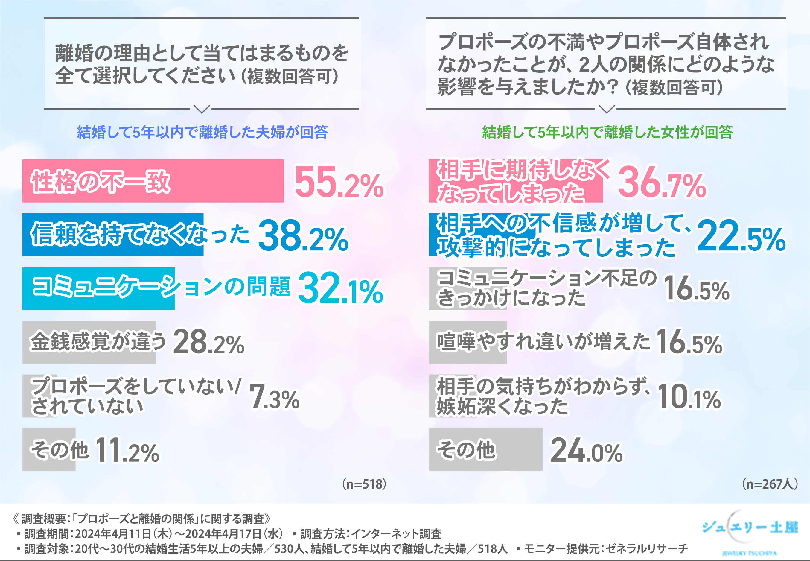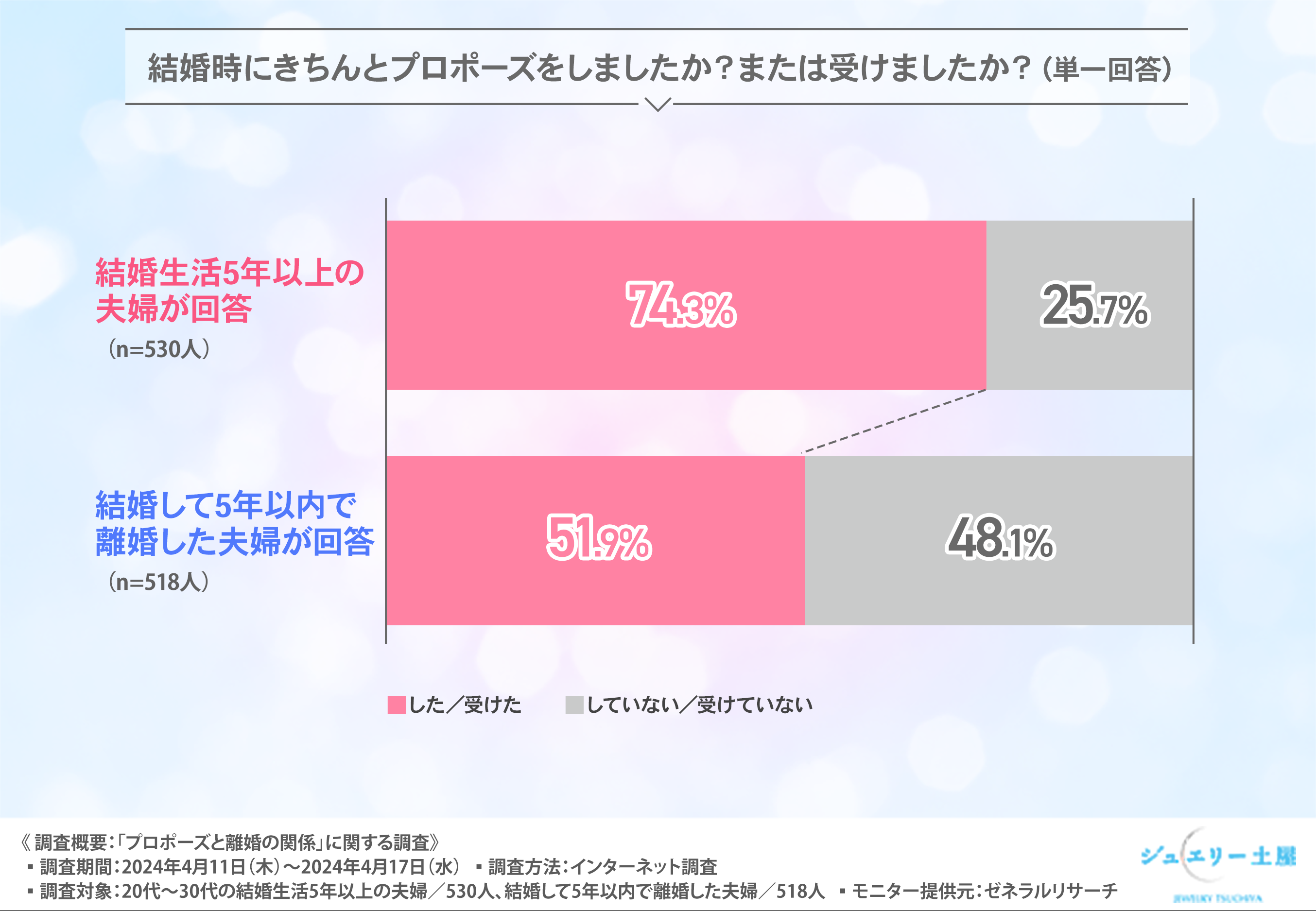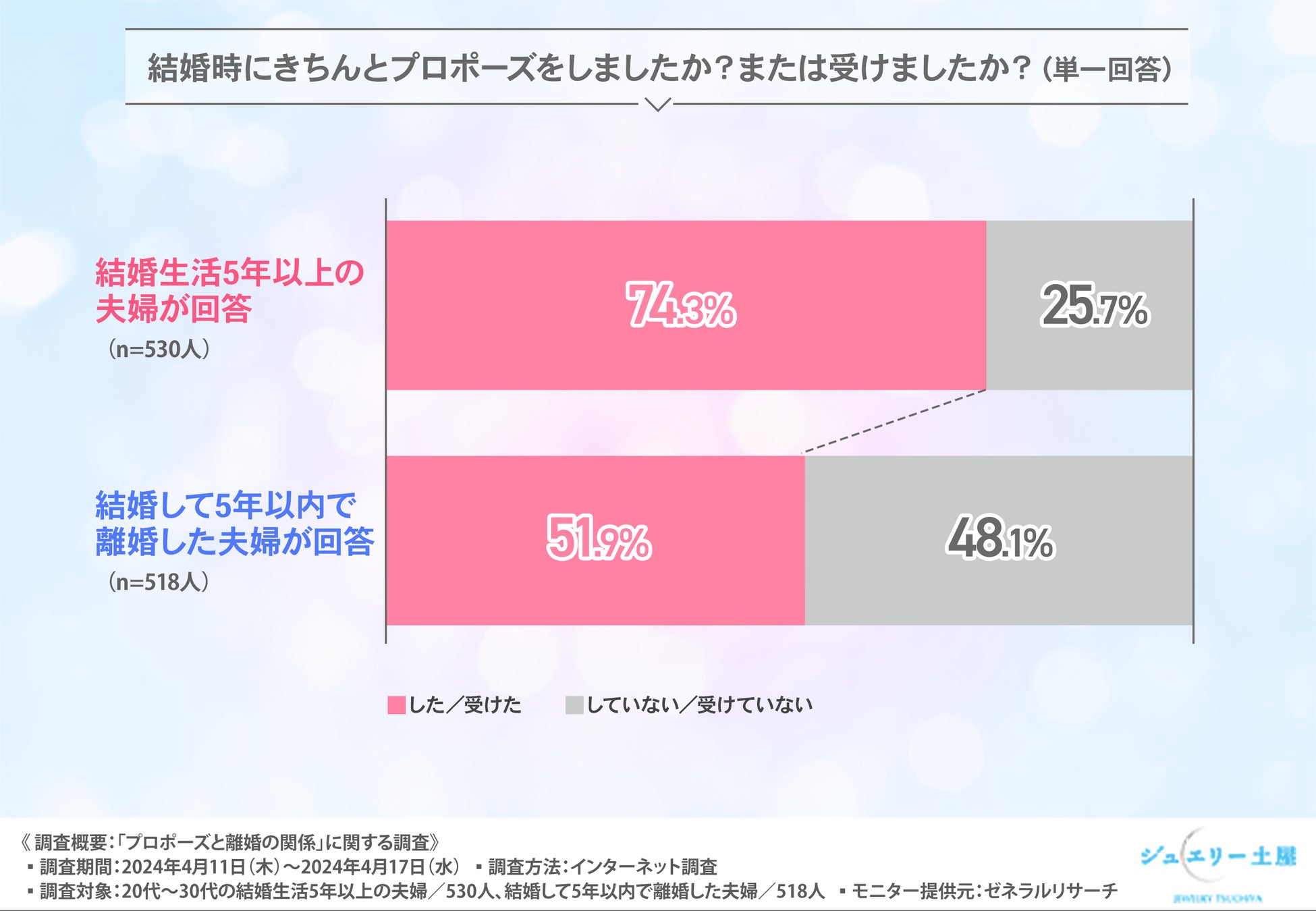 そこで今回、ひと粒パールジュエリーやプロポーズリングなどをオンライン販売で展開するジュエリー土屋(https://jewelry-tsuchiya.com/)は、ジューンブライドやプロポーズの日(6月第1日曜 故・桂由美さんが提唱)に向け、結婚生活5年以上の夫婦と、結婚して5年以内に離婚した夫婦を対象に「プロポーズと離婚の関係」について調査を実施しました。