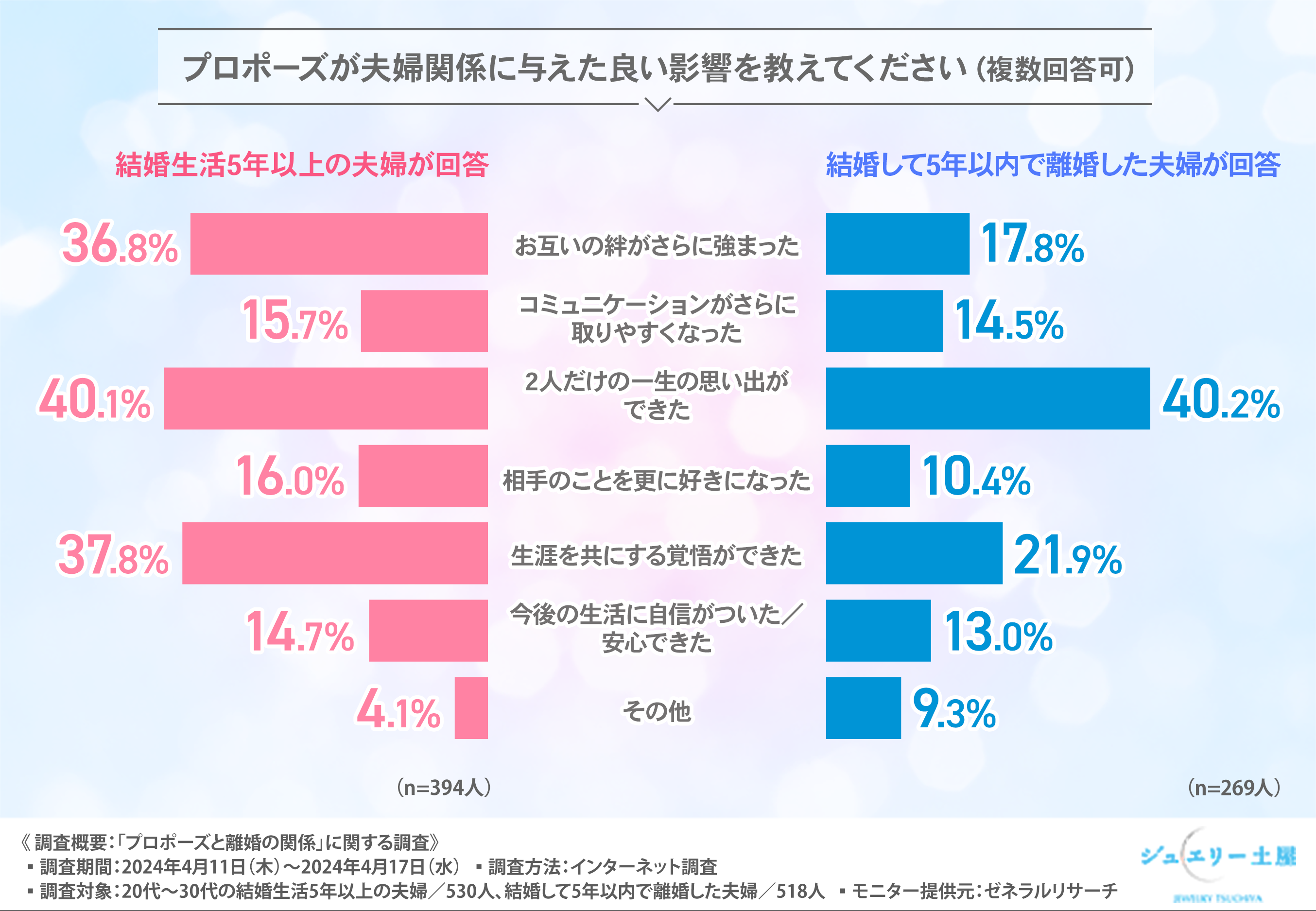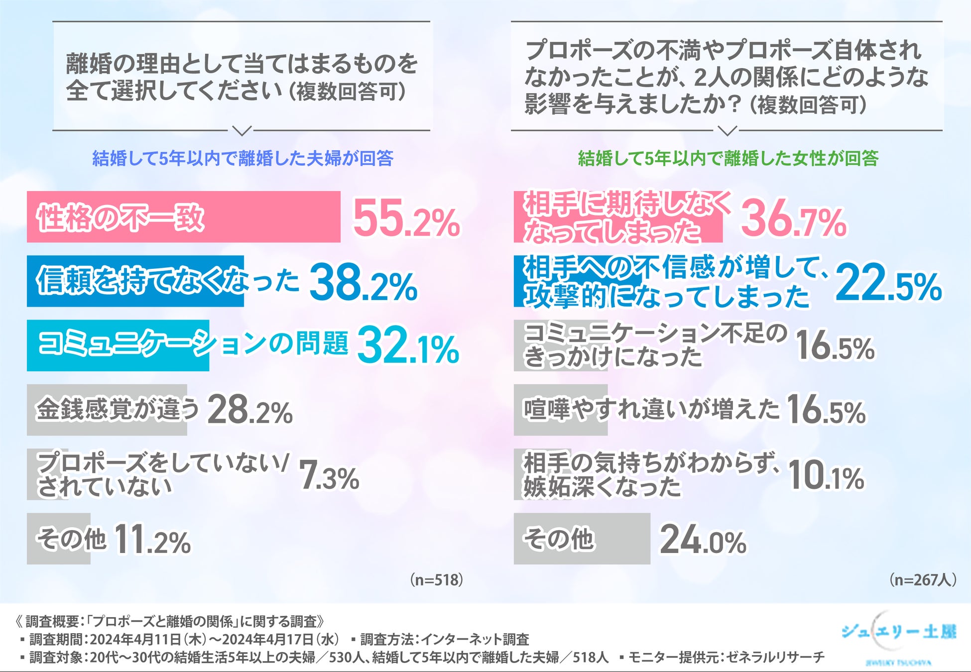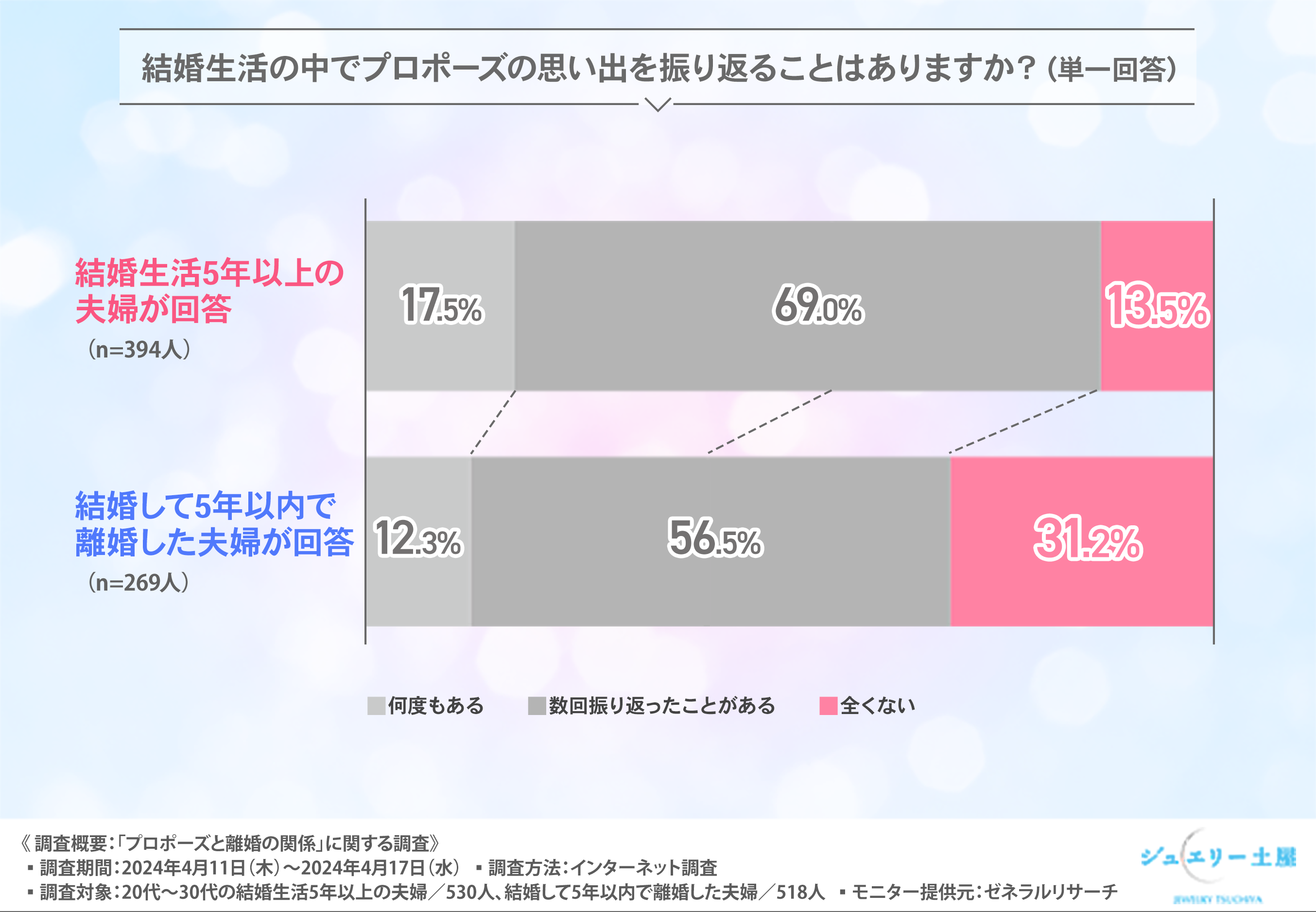 そこで今回、ひと粒パールジュエリーやプロポーズリングなどをオンライン販売で展開するジュエリー土屋(https://jewelry-tsuchiya.com/)は、ジューンブライドやプロポーズの日(6月第1日曜 故・桂由美さんが提唱)に向け、結婚生活5年以上の夫婦と、結婚して5年以内に離婚した夫婦を対象に「プロポーズと離婚の関係」について調査を実施しました。
