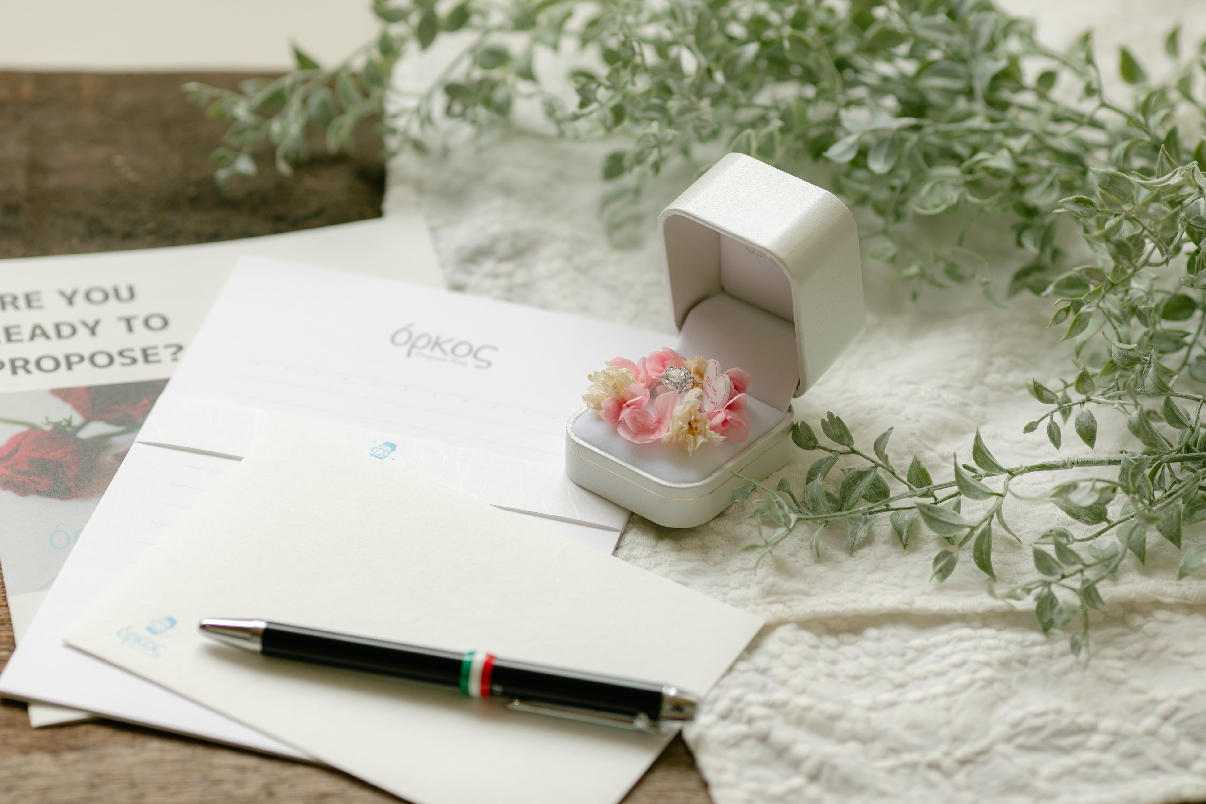 手紙を書くことで、ふたりのこれまでを振り返り、彼女への想いを改めて強く深くできる時間でもあり、プロポーズの言葉をじっくり考えることができます。本番では手紙を読み上げるのもよいし、最後の最後にプチサプライズで渡す演出も可能です。そして、オルコスと一緒に大切なプロポーズで生まれた絆の象徴として、飾ることもできます。