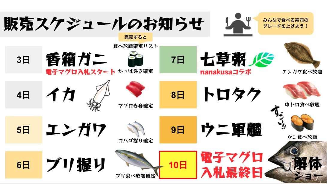 - 電子マグロ初競りオークション期間を盛り上げ、売上によっては企画③で実施する食べ放題イベントで食べられる寿司のグレードが上がっていきます
