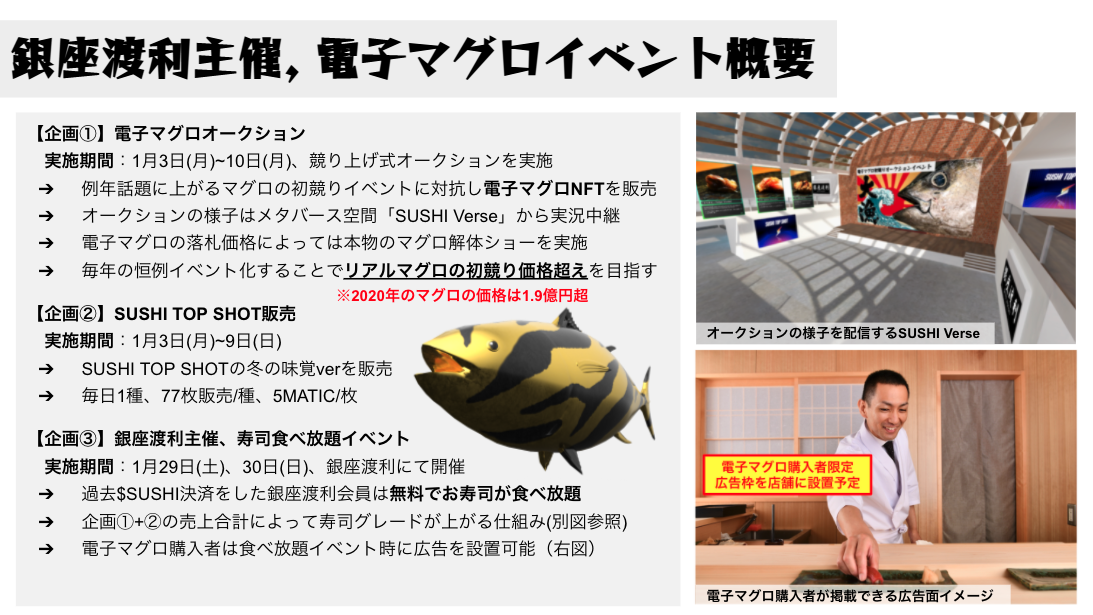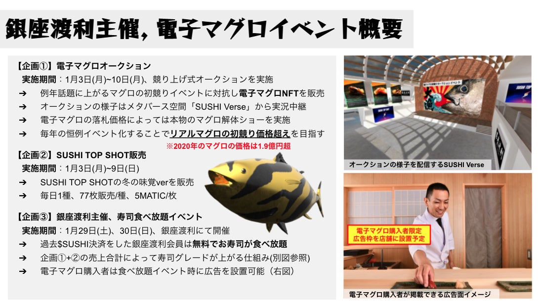 - 例年、年始に話題に上がるマグロの初競りイベントに対抗し、デジタル上のマグロ=電子マグロのNFTを販売します