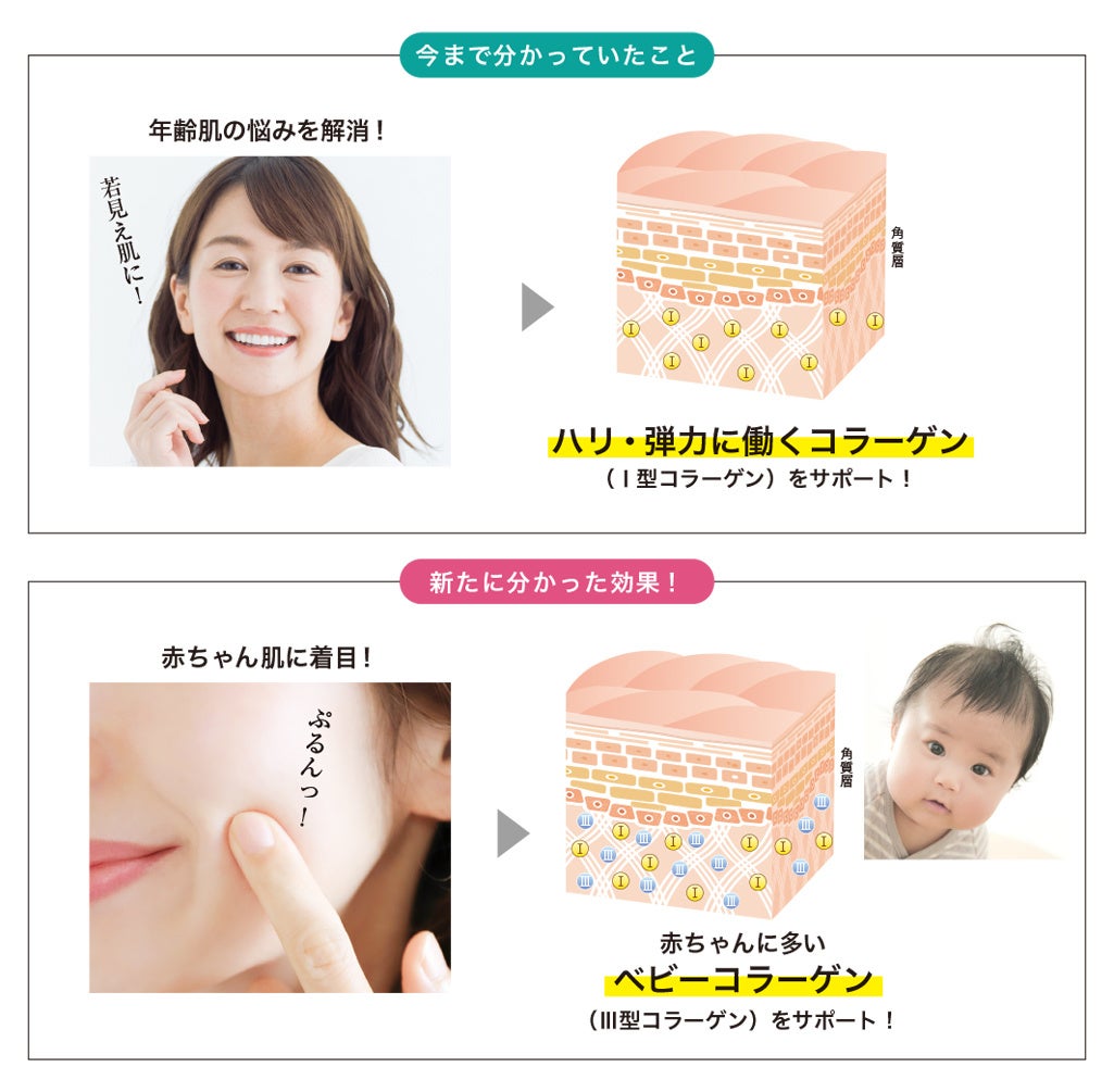 リペアジェルは、肌のハリ・弾力に関与するⅠ型コラーゲンのサポート検証していますが、以前より「もっちり」「しっとり」を実感する声が多く寄せられていました。そこで、第三者機関による効果検証を行った結果、赤ちゃんの肌がモチモチしている理由である「ベビーコラーゲン(Ⅲ型コラーゲン)」のサポートが確認できました。