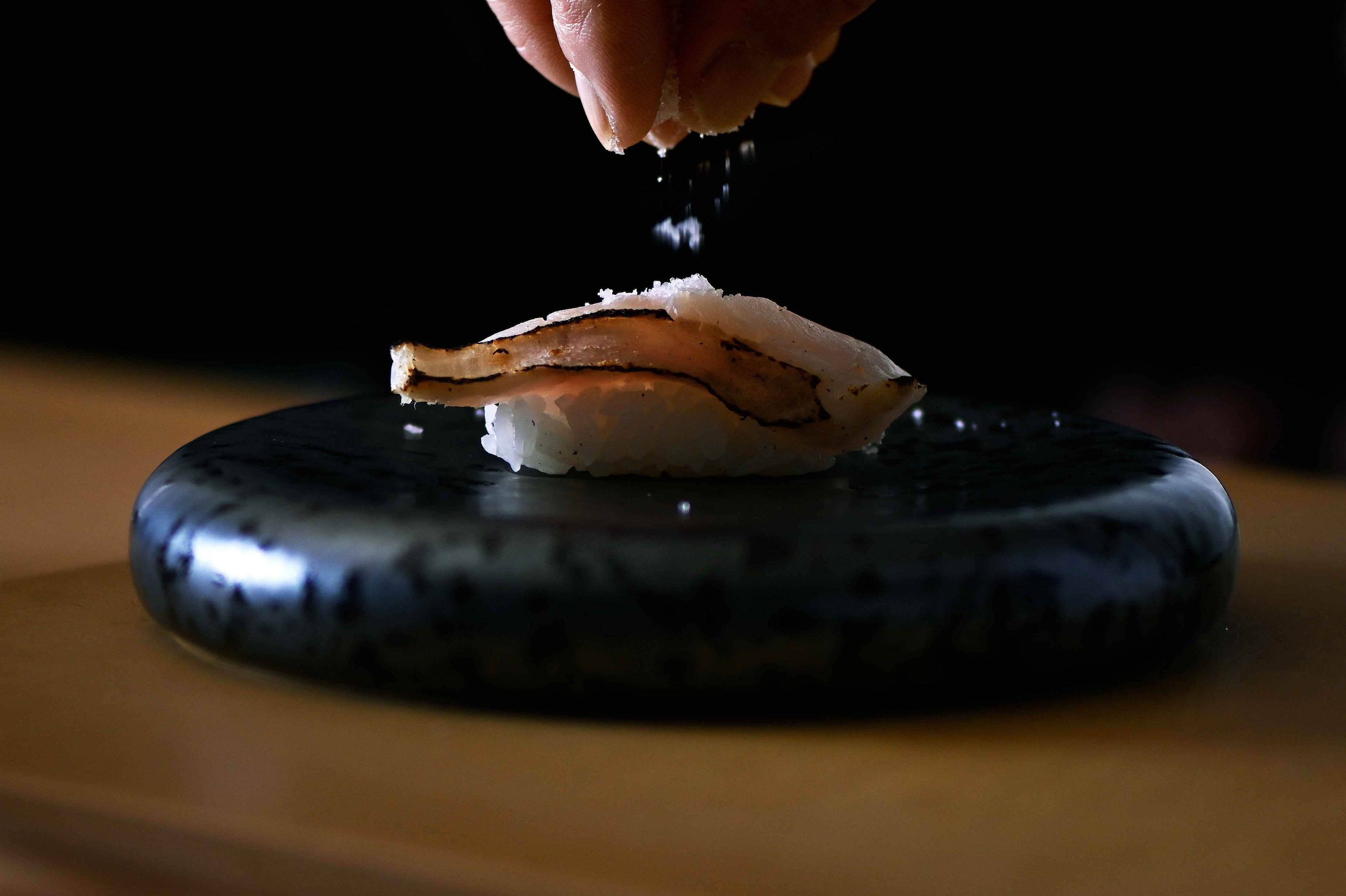 "塩"の奥深さ、風味の豊かさを楽しんでいただけるのも、"長崎前"の魅力です。五島産の海塩を基本に、白身にはまろやかな味わいの対馬の藻塩をおすすめしています。また長崎の柑橘類の皮を乾燥させ粉末にしたものや、海老の殻を香ばしく焼き細かく砕いたものをブレンドするなど、季節ごとの素材の旨味・風味を引き出す当店独自の塩を仕立てています。