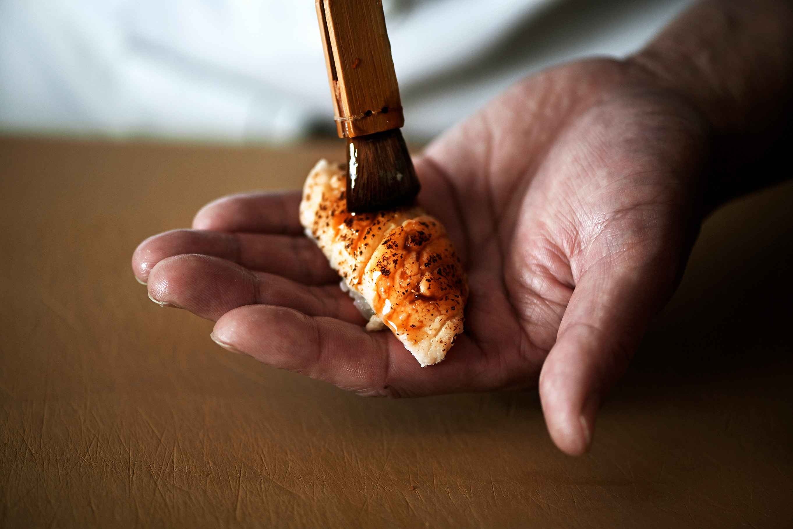 長崎にはご当地醤油と呼べるほど個性的な醤油がありますが、瓊鶴海では既成のものではなく、当店独自のブレンド醤油を寿司・お造りに合わせています。椿の酵母を使った五島の魚醤に、酒・味醂をブレンドし、丁寧に火入れをした醤油は、淡い色合いと穏やかな塩味、ほんのり爽やかな風味が特徴です。