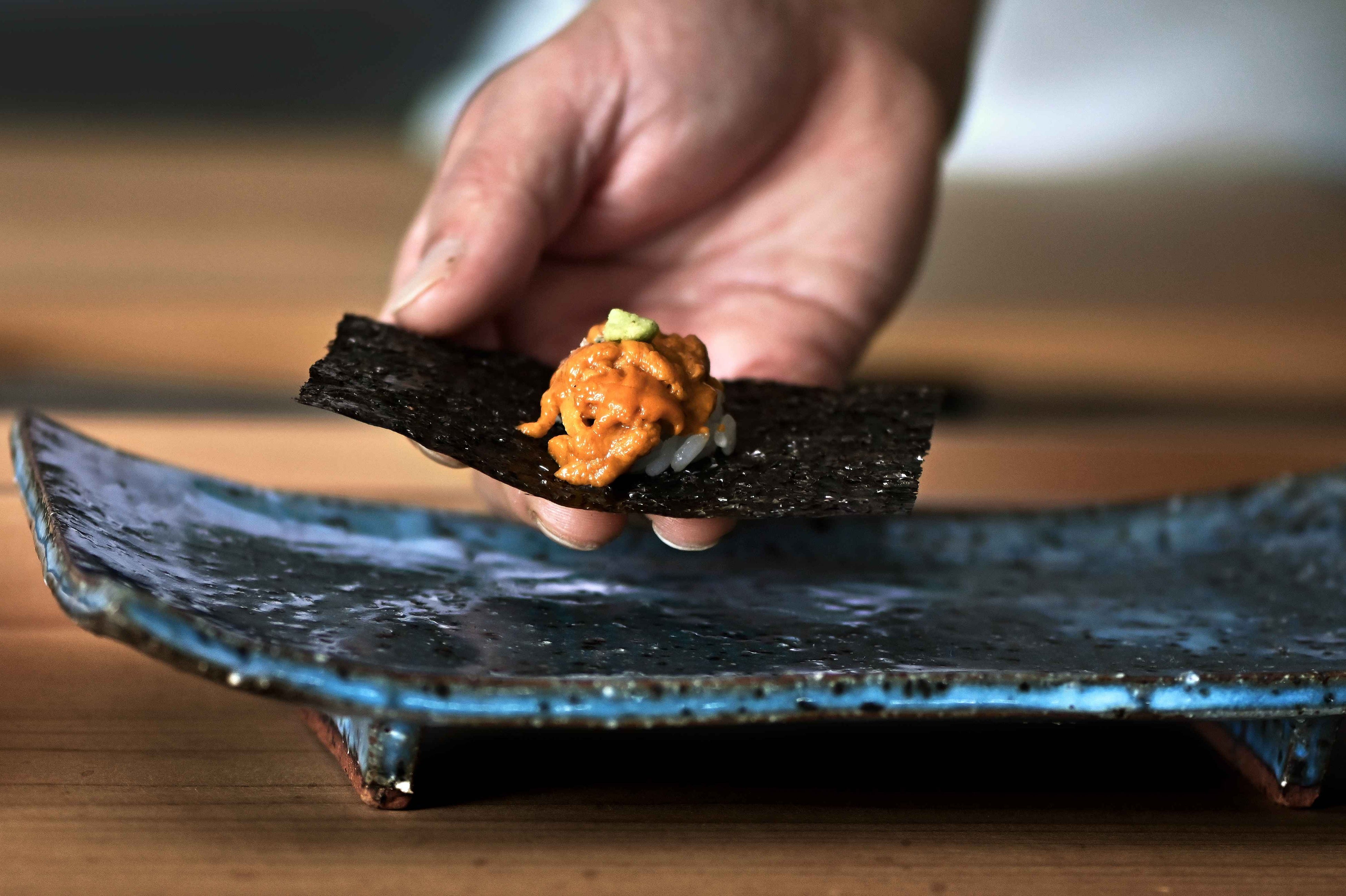 長崎の魚介の魅力・豊かさを味わっていただくために、シャリには長崎の米に加えて佐賀の米をブレンド。且つ新米にこだわらず、程よい水分の米を使うことで、ネタを最大限に引き立てる口当たりとなるように炊き上げています。