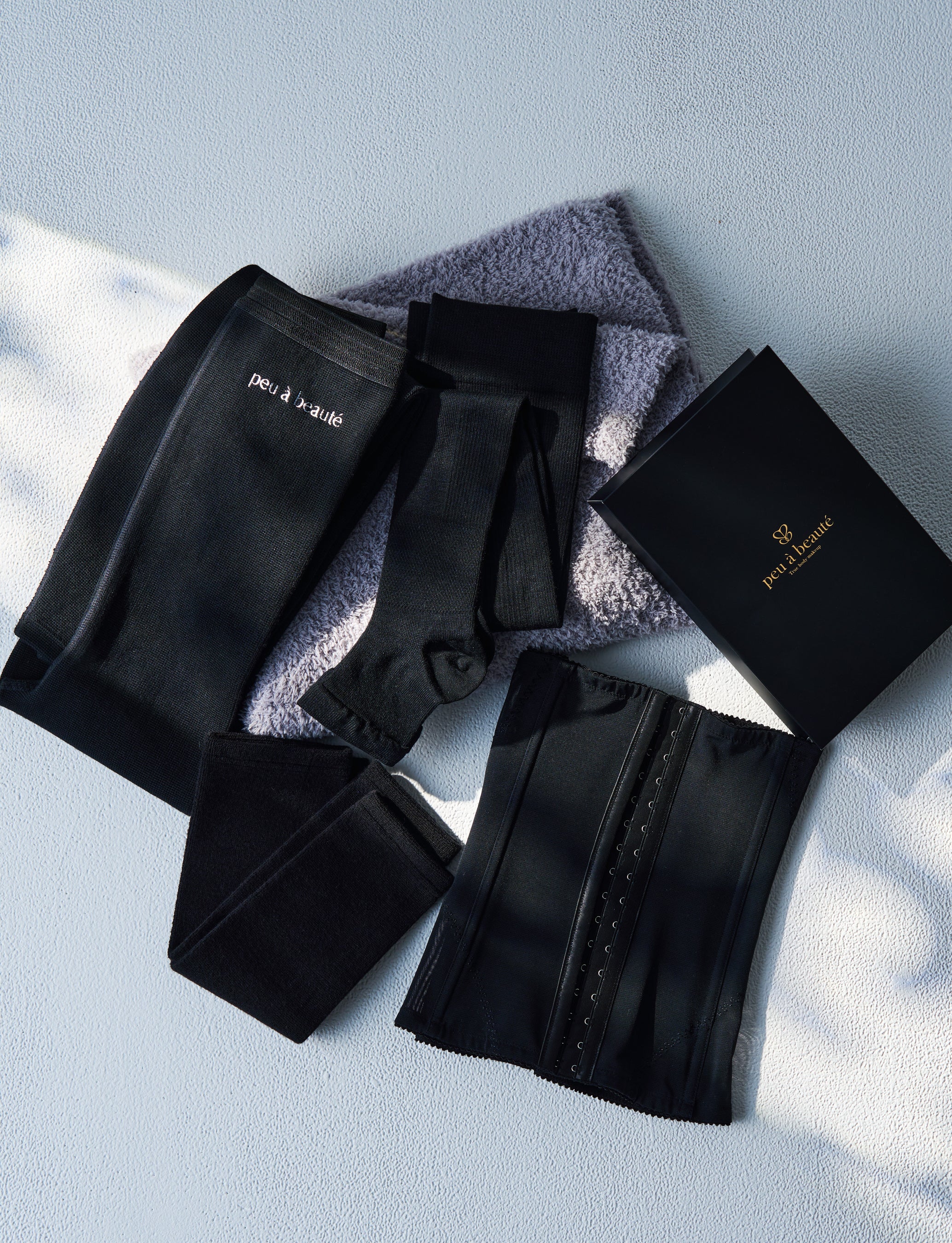 peu a beaute(プウアボーテ)は、エステティックサロンなどでのカウンセリング販売を想定し、国内の職人による丁寧なモノ作りを実現しながらも、光電子®繊維を贅沢に使用した高品質・高機能な日本の『機能性美容インナーアパレル』ブランドです。体温を利用して遠赤外線を輻射することで、血行促進やむくみ軽減、冷え対策をサポートし、スパッツやガードルなどでシェイプアップ、骨盤ケア、姿勢サポートなどを「着るだけ」で実現し、美容・エステサロンでも人気です。 締め付けず着続けられる機能性インナーとして開発されたシリーズです。