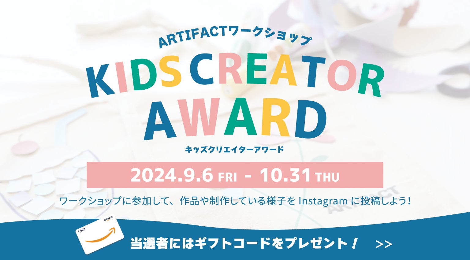 また、初のワークショップ開催を記念して、制作いただいた素敵な作品を投稿でAmazonギフトコードが当たる、「アーティファクト キッズクリエイターアワード」を同時開催いたします。