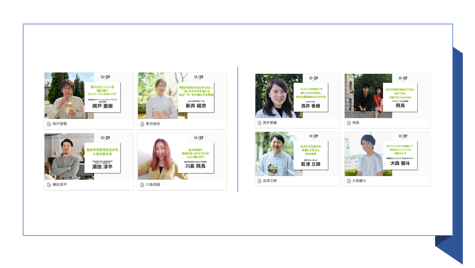 「U-29 キャリア図鑑(試験(β)版)」は、公立学校に勤務する学校教員向けに制作したゲストティーチャーマッチングサイトです。利用者は、運営会社が展開する10代・20代向けのインタビューサイト「U-29 ドットコム(https://u-29.com/ )」に登場する掲載先の一部に向けて、基本無料で登壇依頼を送ることができます。