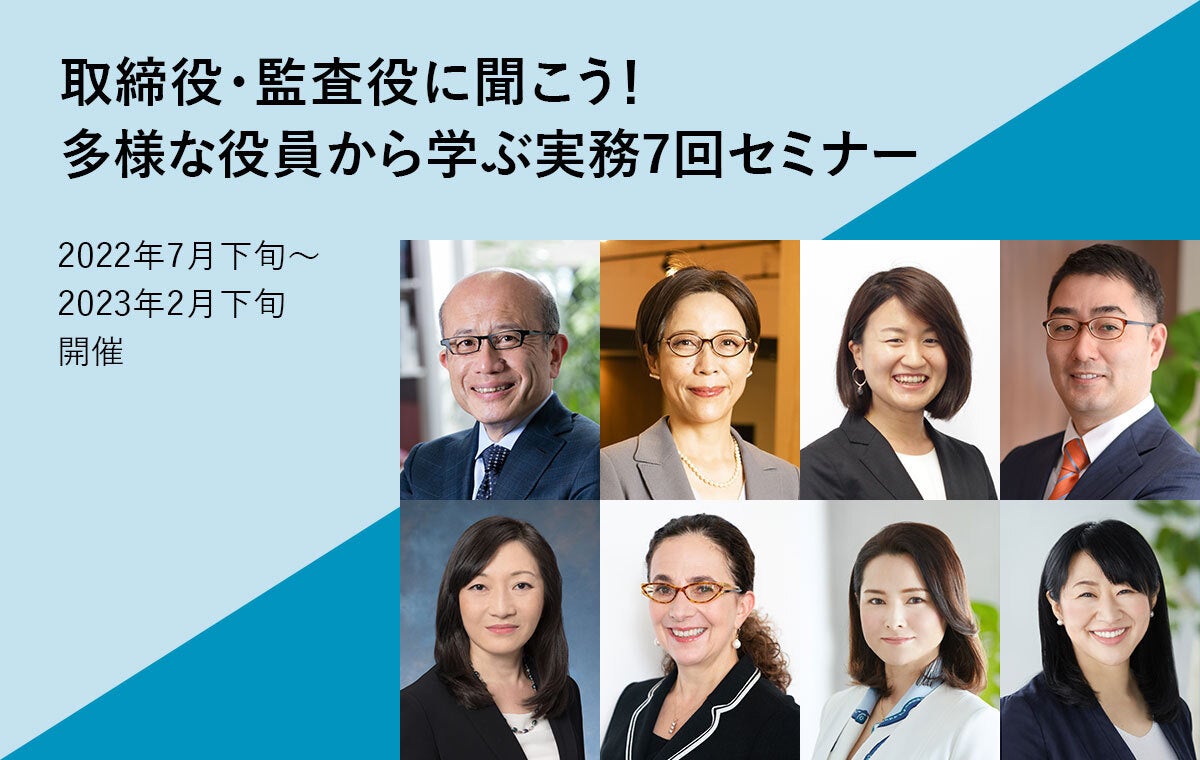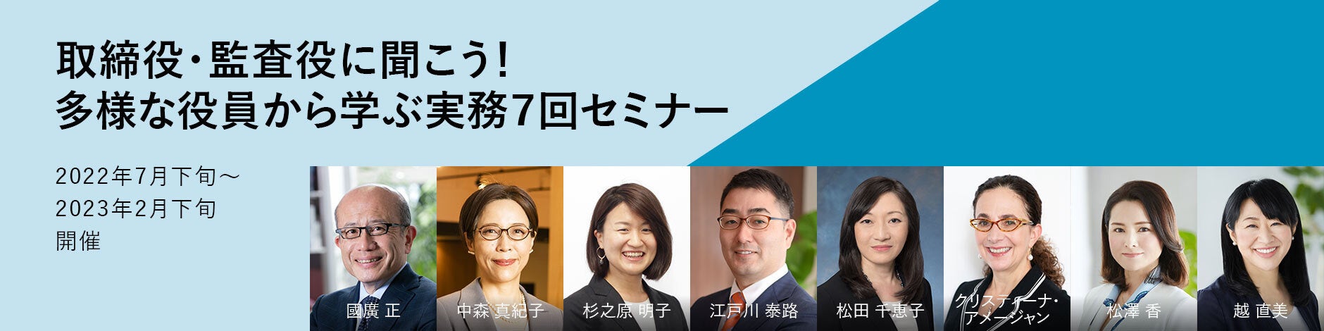 ご好評を頂いた「第一線で活躍する女性役員に聞こう!多様な女性役員の本音に迫る7回セミナー」に引き続き、多様なバックグランドを持つ取締役・監査役をゲストとしてお招きし、取締役・監査役の役割と実務、ご自身のキャリア形成等についてお聞きします。教科書だけでは分からない役員実務や専門性を生かして企業価値向上に貢献する術を学ぶ機会をご提供します。