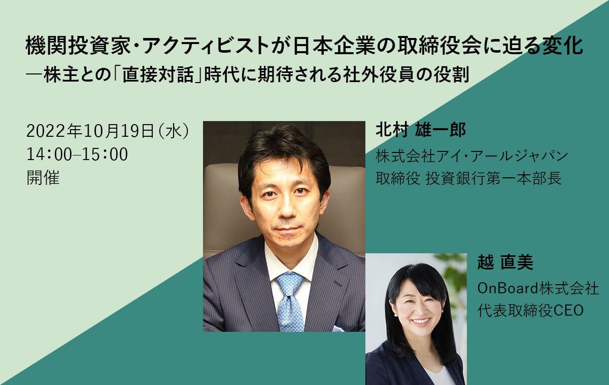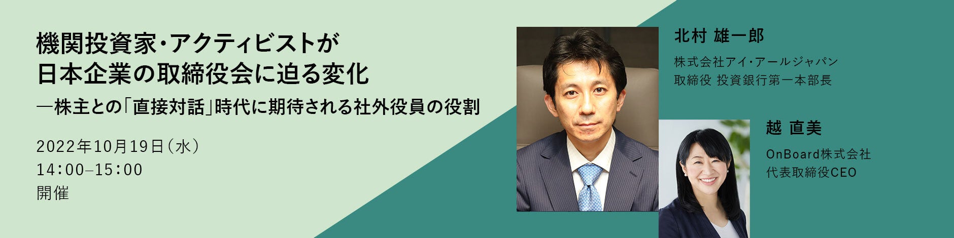 機関投資家・アクティビストの視点に着目し、アイ・アール ジャパン北村雄一郎氏から、最新動向について解説いただきます。取締役・監査役をつとめられる方はもちろんのこと、企業のご担当者の方もぜひご参加ください。