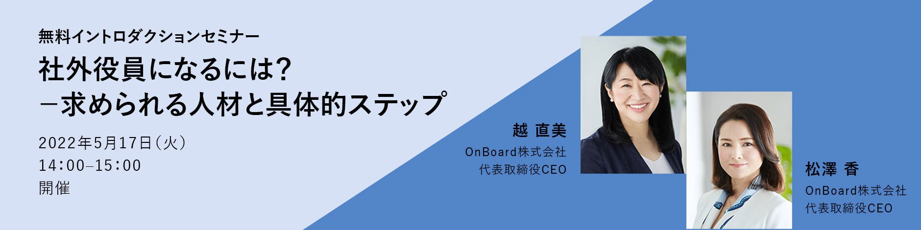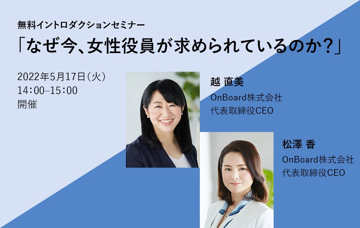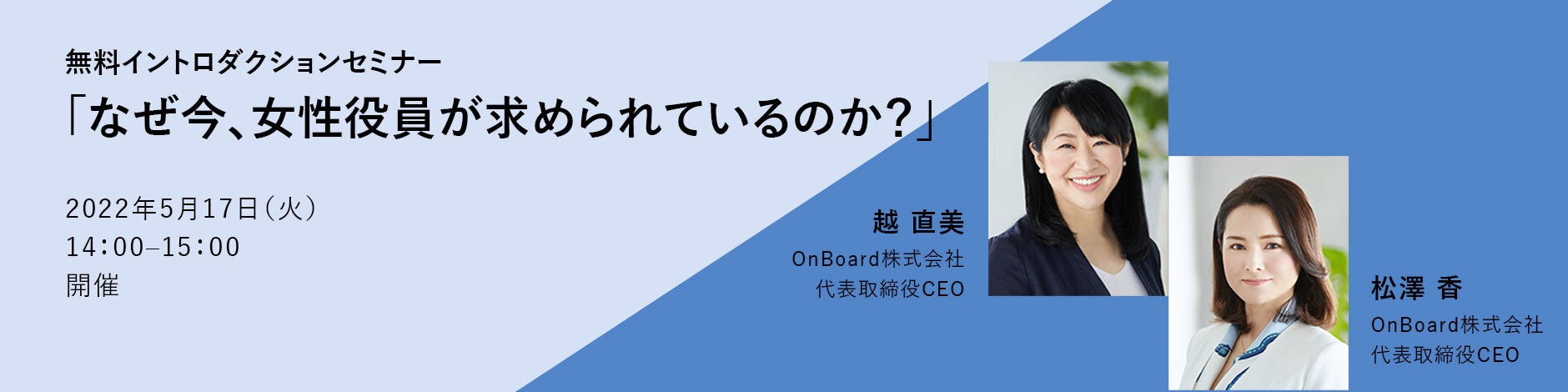 元大津市長で弁護士の越直美と弁護士の松澤香による、女性役員の育成・紹介に特化したOnBoard株式会社(以下、「OnBoard」といいます。)が2022年度もシリーズセミナーを開催いたします。