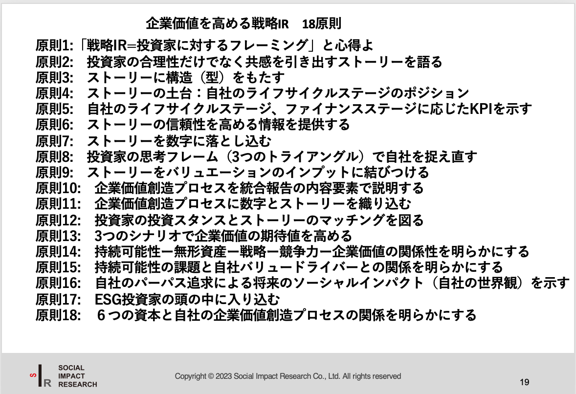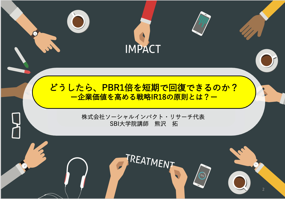 関心がある企業様に、どうしたらPBR1倍を短期で回復できるのか?戦略IR18の原則のプレゼン資料を無料プレゼントさせて頂きます。 問い合わせ先:takukumazawa@gmail.com