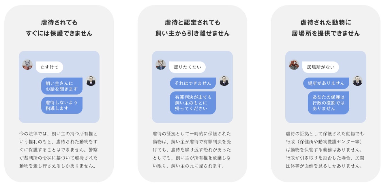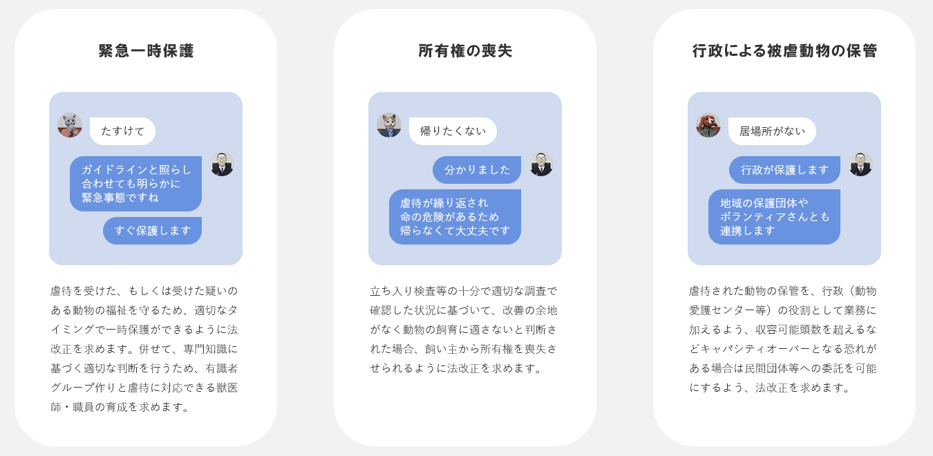 「#飼い主に傷つけられた動物を守れる社会に」署名活動プロジェクトでは、以下の3点の実現を目指します。