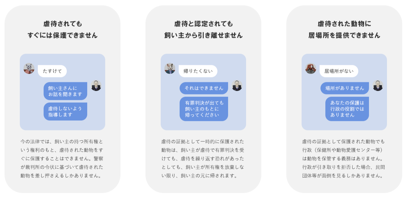 虐待された動物は、証拠として一時的に保護されても、動物虐待罪で飼い主が有罪になったとしても、飼い主が所有権を放棄しなければ、結局は飼い主の元へ返されてしまいます。また、現行法のもと、保健所や動物愛護センター等の行政には、そもそも動物を保管する義務がないため、虐待された動物を保護する体制が確立されていないといった問題があります。