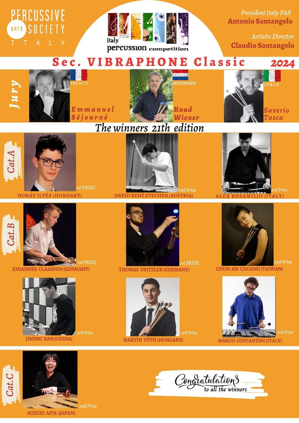第21回イタリア国際打楽器コンクールヴィブラフォンクラシック部門Cにおいて、會田瑞樹が単独ファイナリストとして選出、最高位(第二位/一位、三位なし)を受賞致しましたことをご報告申し上げます。