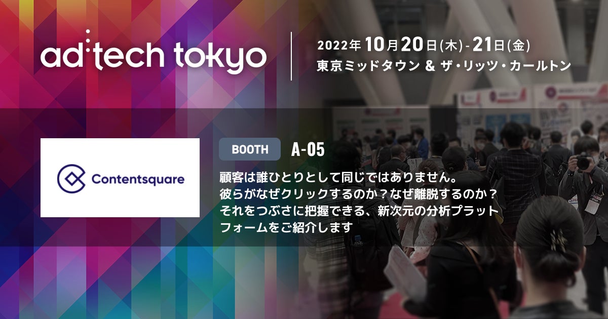 ウェブサイトやモバイルアプリなどのUX・UIをデータに基づいて改善できるようにし、デジタルビジネスの収益を高める道筋を示す分析プラットフォームを展開するContentsquare Japan合同会社は、2022年10月20日、21日に東京都内で開催される「ad:tech tokyo 2022(アドテック東京2022)」に出展いたします。