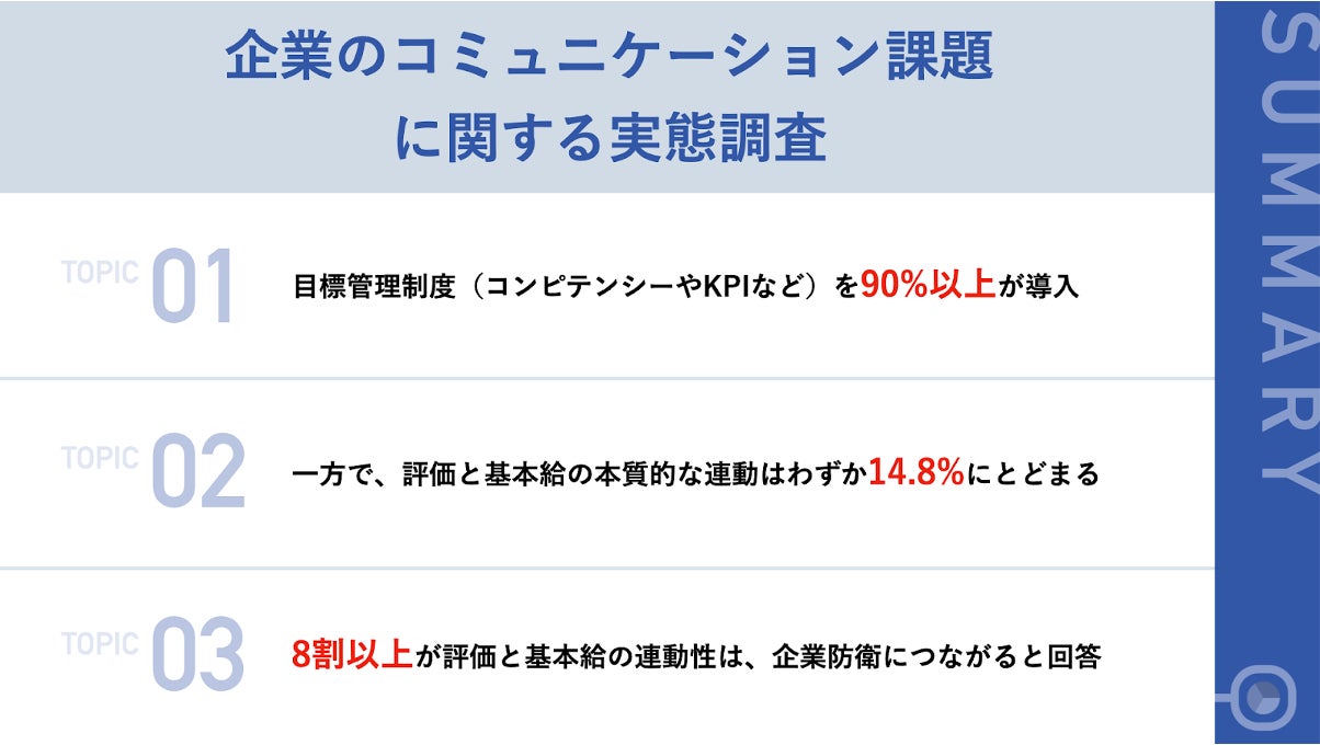 目標管理制度は90%以上が導入の一方、評価と基本給の本質的な連動はわずか14.8% 評価と報酬への連動により8割以上が企業防衛につながると回答