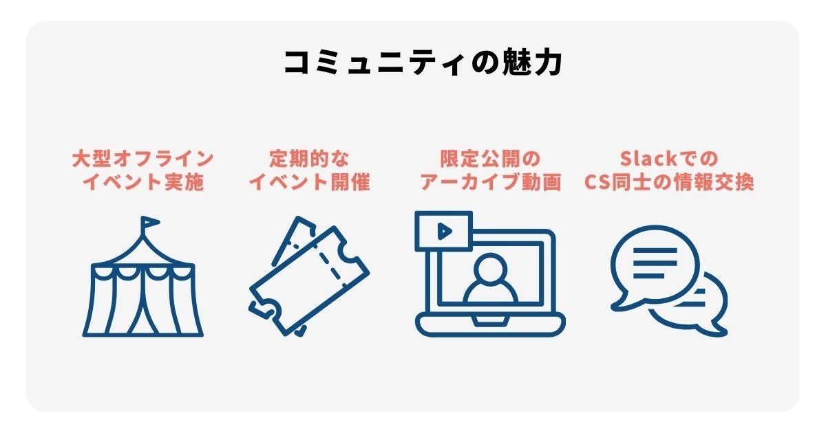 CS KOMMONSでは、2024年1月に大型オフラインイベント 「SUCCESS CAMP 2024 〜灯そう。〜」にて100名を超えるCS担当者に参加いただくなど、CS担当者を対象にしたイベントを定期的に開催しています。イベント開催のほか、コミュニティ内限定でアーカイブ動画の公開や、Slackを活用したCS同士の情報交換を実施しています。