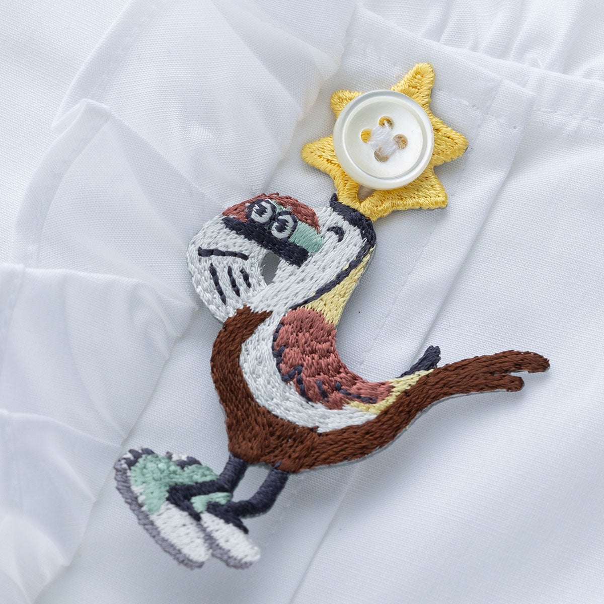 ボタンフックとは刺繍したモチーフにボタンホールをあけ、シャツボタン程度の大きさのボタンになら、どこにでもつけることが出来るアクセサリー。