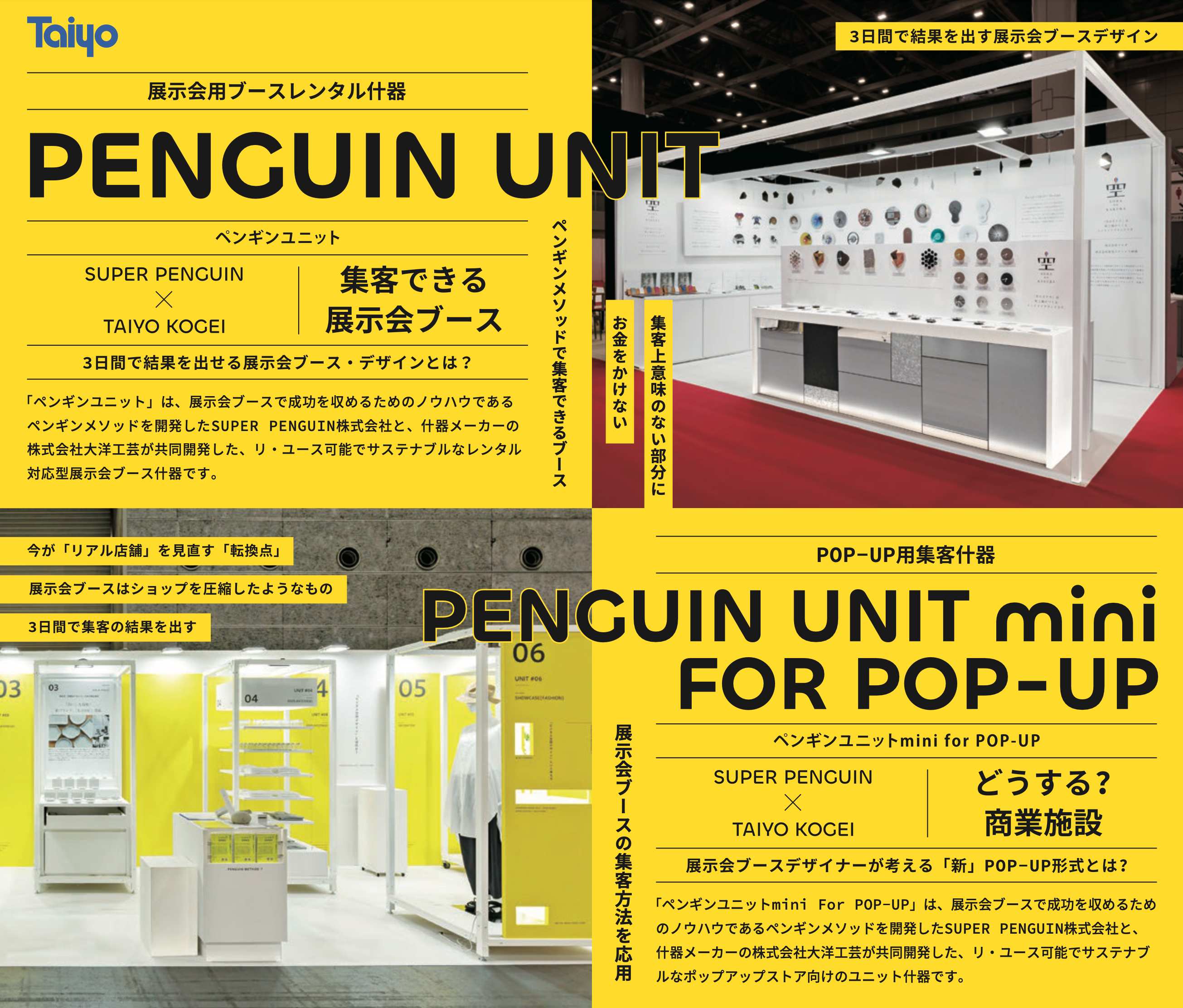 商業施設の店舗・什器をデザインする株式会社大洋工芸(本社:大阪市西淀川区)は、展示会ブースデザインを手掛けるSUPER PENGUIN株式会社(本社:東京都品川区)と共同開発したレンタル対応型什器ユニット「PENGUIN UNIT」を店舗総合見本市「JAPANSHOP 2024(3月12日~15日・東京ビッグサイト)」に出展します。