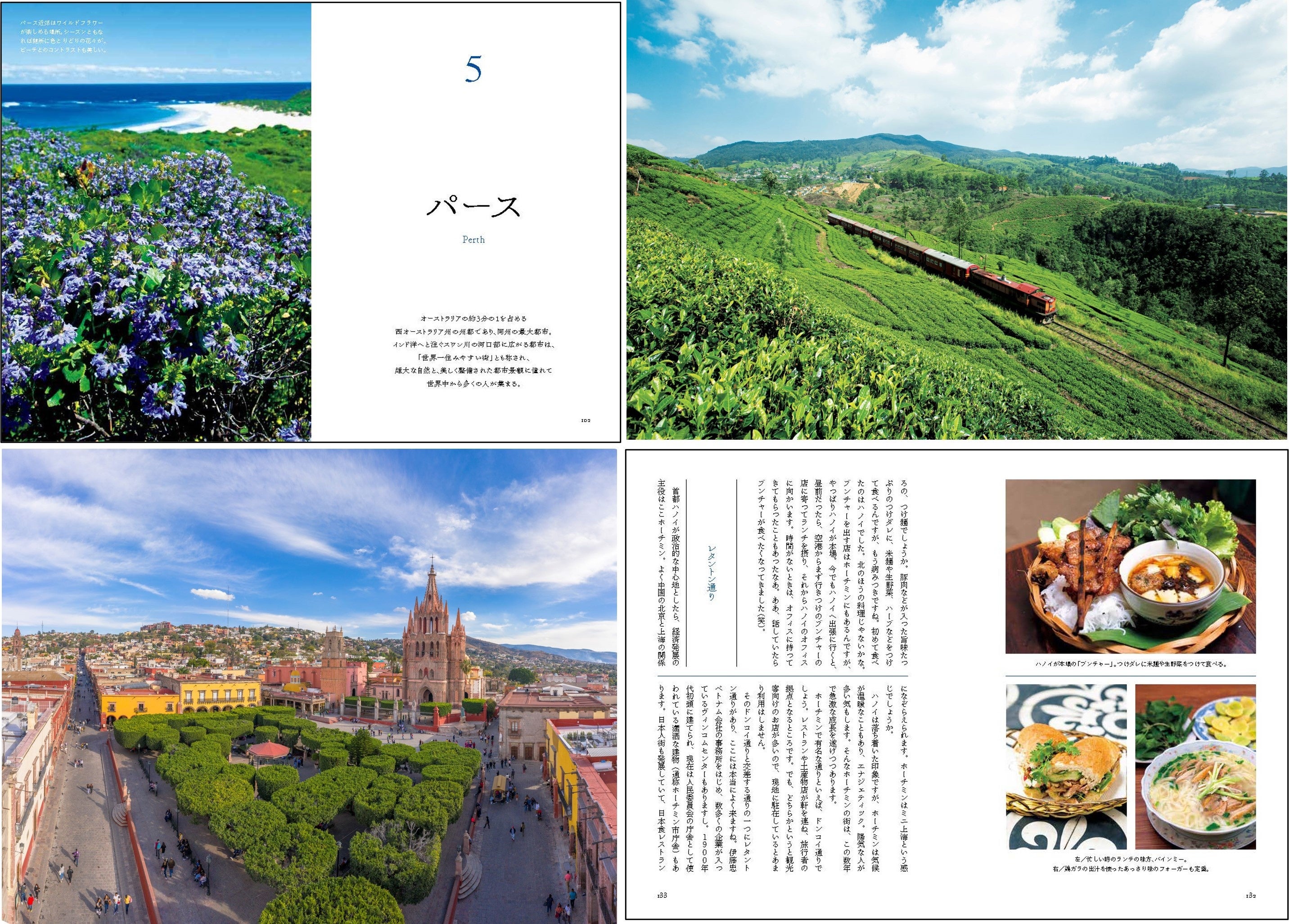 本冊子では、9つのエリアの有名な観光地を押さえつつも、ロンドンでいまもっともホットなスポットと言われるショーディッチや、メキシコシティ近郊の真っ白な街・タスコ、スリランカの茶畑を縦断する鉄道など、駐在員だからこその知る人ぞ知るロケーションを数多く掲載。絶景からカルチャーまで、駐在員の言葉と美しい写真でお届けします。もちろん、ローカルフードや土地のお酒もたくさん登場。駐在員家族の視点でオススメするご当地のお土産も紹介しています。