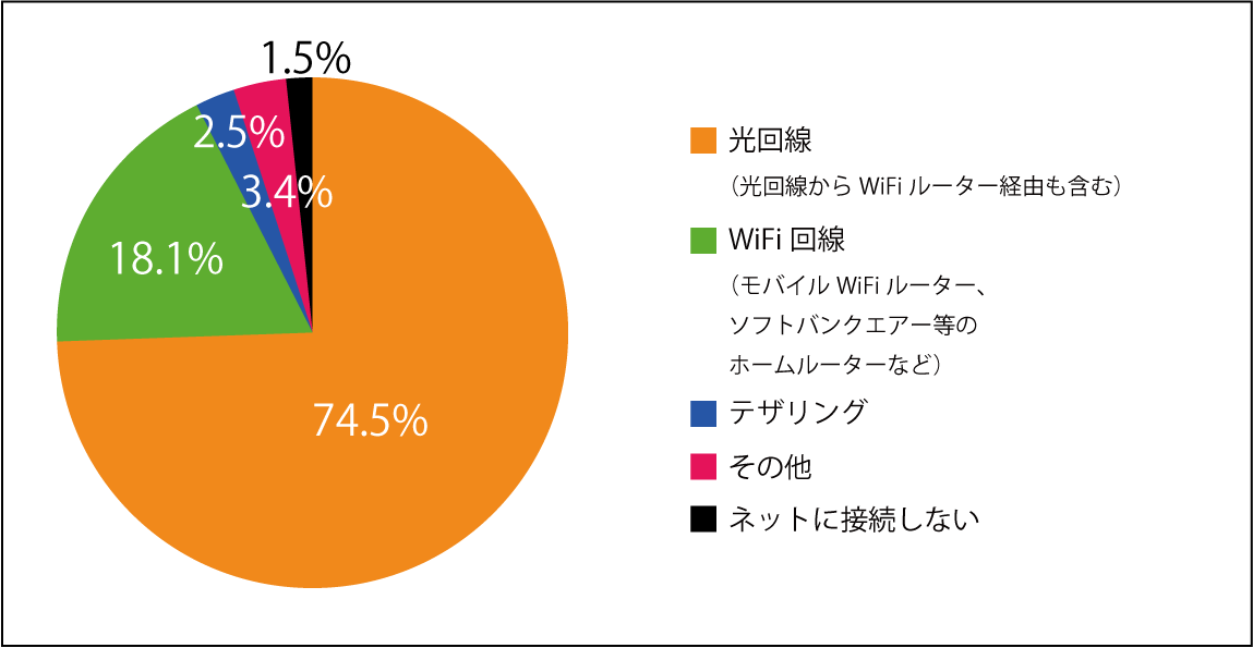 自宅のPCの主なインターネット環境は光回線が最も多く74.5%、次いでWiFi回線(モバイルWiFiルーター、ソフトバンクエアー等のホームルーターなど)18.1%、テザリングが2.5%、その他が3.4%という結果でした。